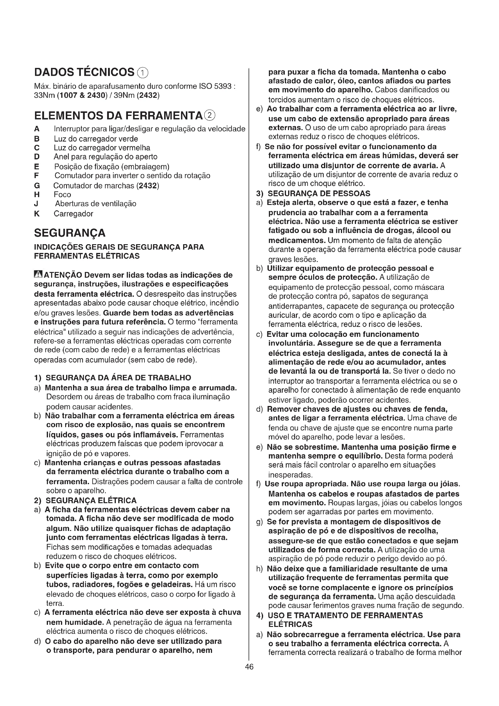 A Interruptor para ligar/desligar e regulação da velocidade B Luz do carregador verde C Luz do carregador vermelha D Anel para regulação do aperto E Posição de xação (embraiagem) F Comutador para inverter o sentido da rotação G Comutador de marchas (2432) H Foco J Aberturas de ventilação K Carregador SEGURANÇA INDICAÇÕES GERAIS DE SEGURANÇA PARA