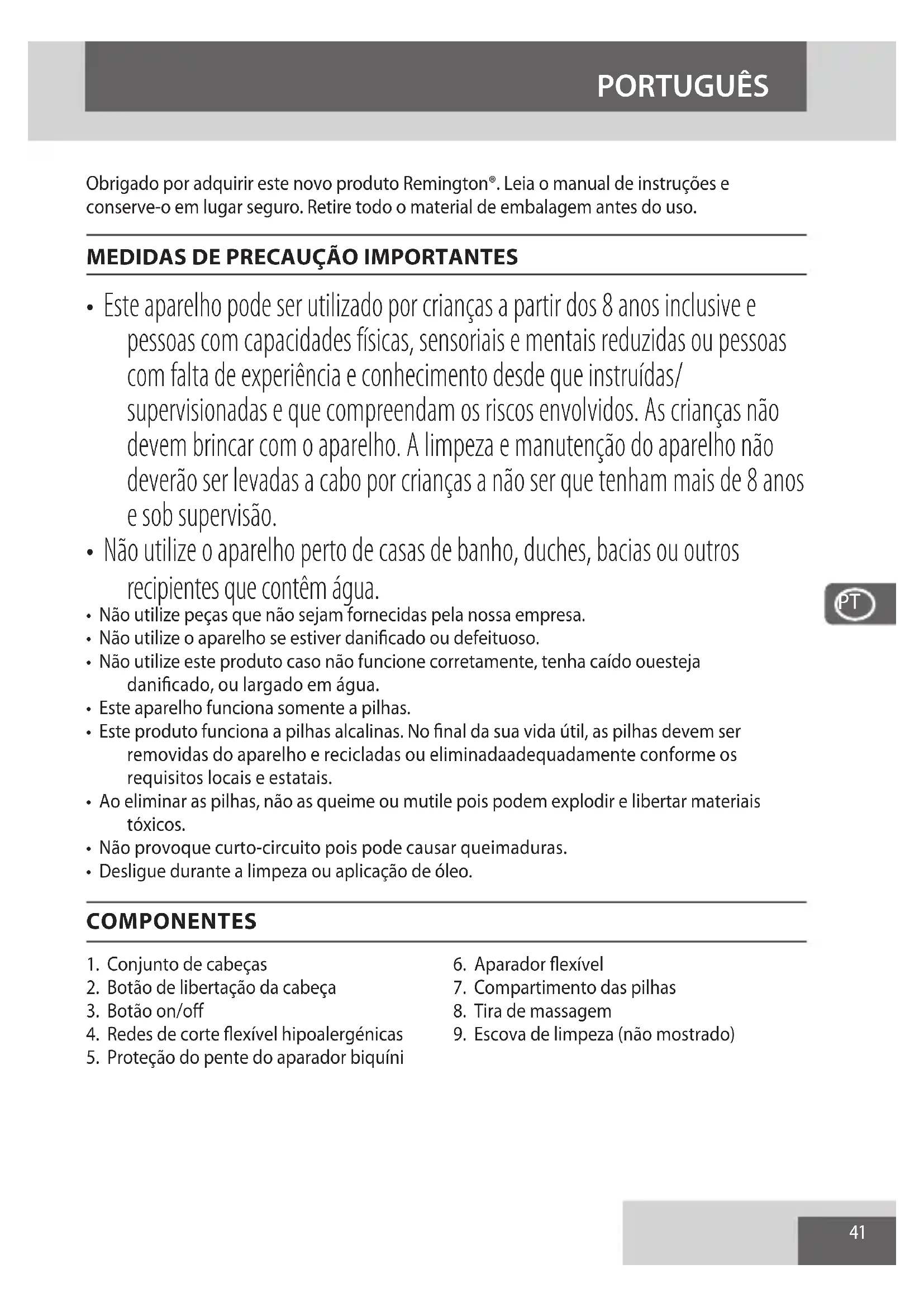 - Este aparelho pode ser utilizado por crianças a partir dos 8 anos inclusive e pessoas com capacidades físicas, sensoriais e mentais reduzidas ou pessoas com falta de experiência e conhecimento desde que instruídas/ supervisionadas e que compreendam os riscos envolvidos. As crianças não devem brincar com o aparelho. A limpeza e manutenção do aparelho não deverão ser levadas a cabo por crianças a não ser que tenham mais de 8 anos e sob supervisão.