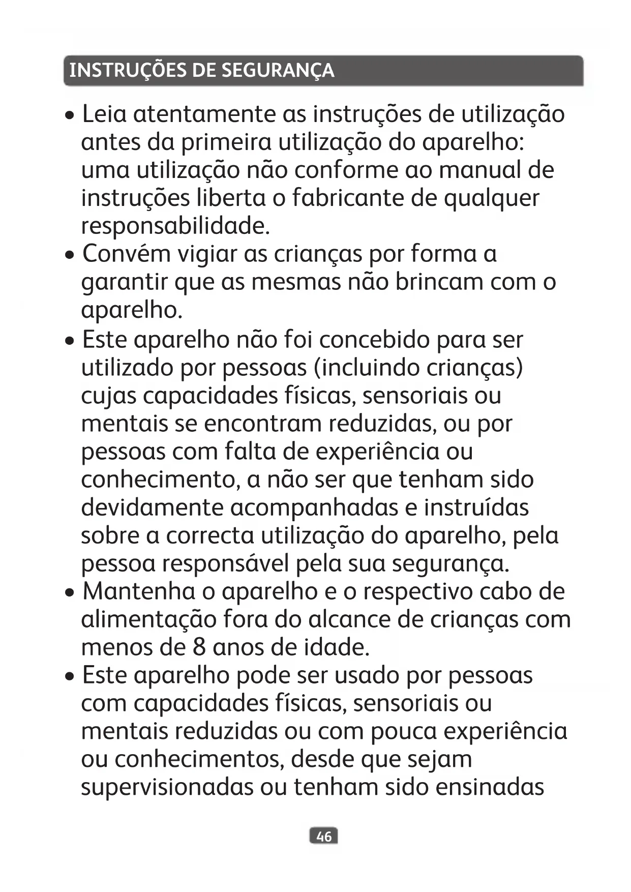 - Esteaparelhonãofoiconcebidoparaser utilizadoporpessoas(incluindocrianças) cujascapacidadesfísicas,sensoriaisou mentaisseencontramreduzidas,oupor pessoascomfaltadeexperiênciaou conhecimento,anãoserquetenhamsido devidamenteacompanhadaseinstruídas sobreacorrectautilizaçãodoaparelho,pela pessoaresponsávelpelasuasegurança.