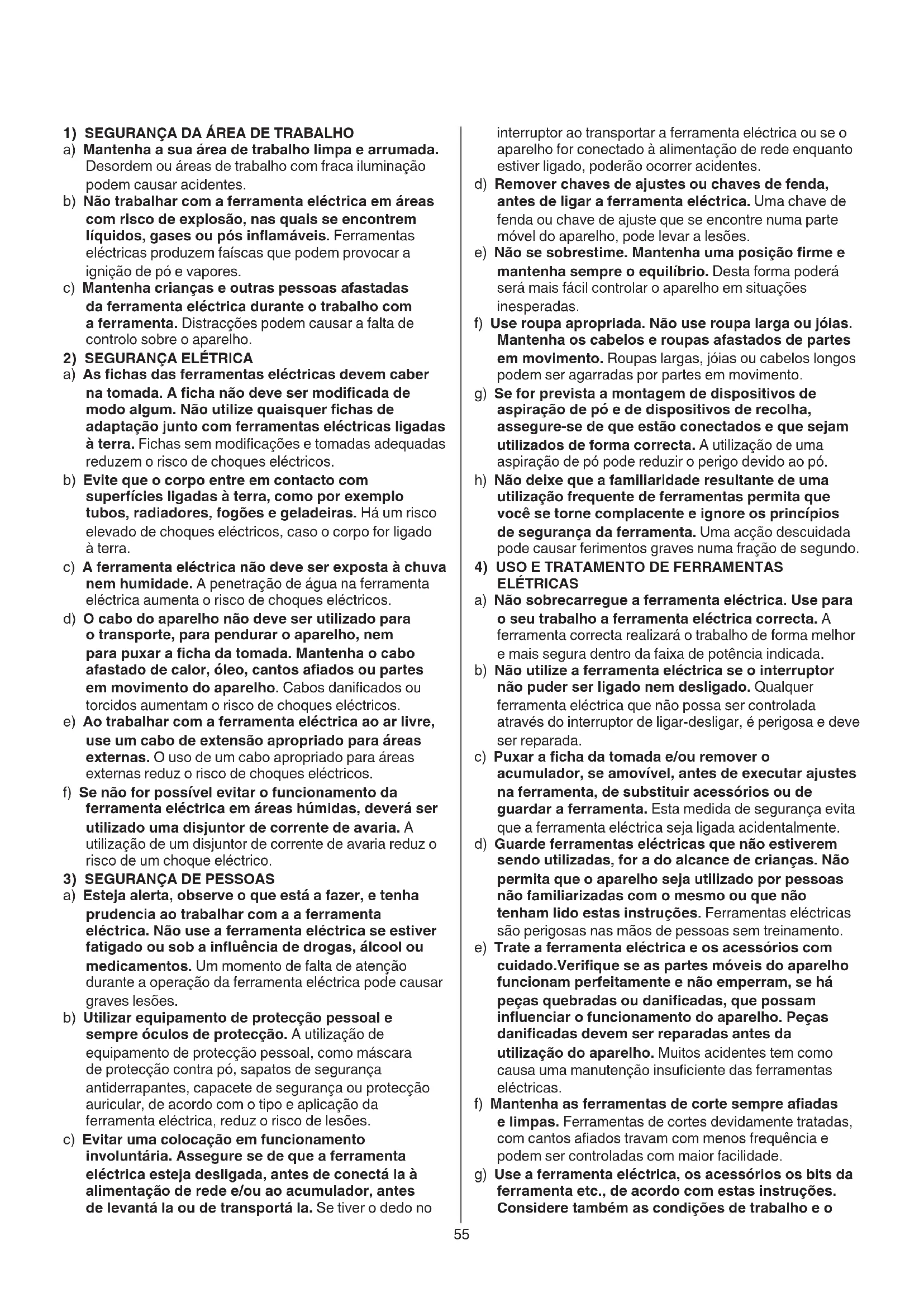 ELÉTRICAS a) Não sobrecarregue a ferramenta eléctrica. Use para o seu trabalho a ferramenta eléctrica correcta. A ferramenta correcta realizará o trabalho de forma melhor e mais segura dentro da faixa de potência indicada. b) Não utilize a ferramenta eléctrica se o interruptor não puder ser ligado nem desligado. Qualquer ferramenta eléctrica que não possa ser controlada através do interruptor de ligar-desligar, é perigosa e deve ser reparada. c) Puxar a cha da tomada e/ou remover o acumulador, se amovível, antes de executar ajustes na ferramenta, de substituir acessórios ou de guardar a ferramenta. Esta medida de segurança evita que a ferramenta eléctrica seja ligada acidentalmente. d) Guarde ferramentas eléctricas que não estiverem sendo utilizadas, for a do alcance de crianças. Não permita que o aparelho seja utilizado por pessoas não familiarizadas com o mesmo ou que não tenham lido estas instruções. Ferramentas eléctricas são perigosas nas mãos de pessoas sem treinamento. e) Trate a ferramenta eléctrica e os acessórios com cuidado.Verique se as partes móveis do aparelho funcionam perfeitamente e não emperram, se há peças quebradas ou danicadas, que possam inuenciar o funcionamento do aparelho. Peças danicadas devem ser reparadas antes da utilização do aparelho. Muitos acidentes tem como causa uma manutenção insuciente das ferramentas eléctricas. f) Mantenha as ferramentas de corte sempre aadas e limpas. Ferramentas de cortes devidamente tratadas, com cantos aados travam com menos frequência e podem ser controladas com maior facilidade. g) Use a ferramenta eléctrica, os acessórios os bits da ferramenta etc., de acordo com estas instruções. Considere também as condições de trabalho e o