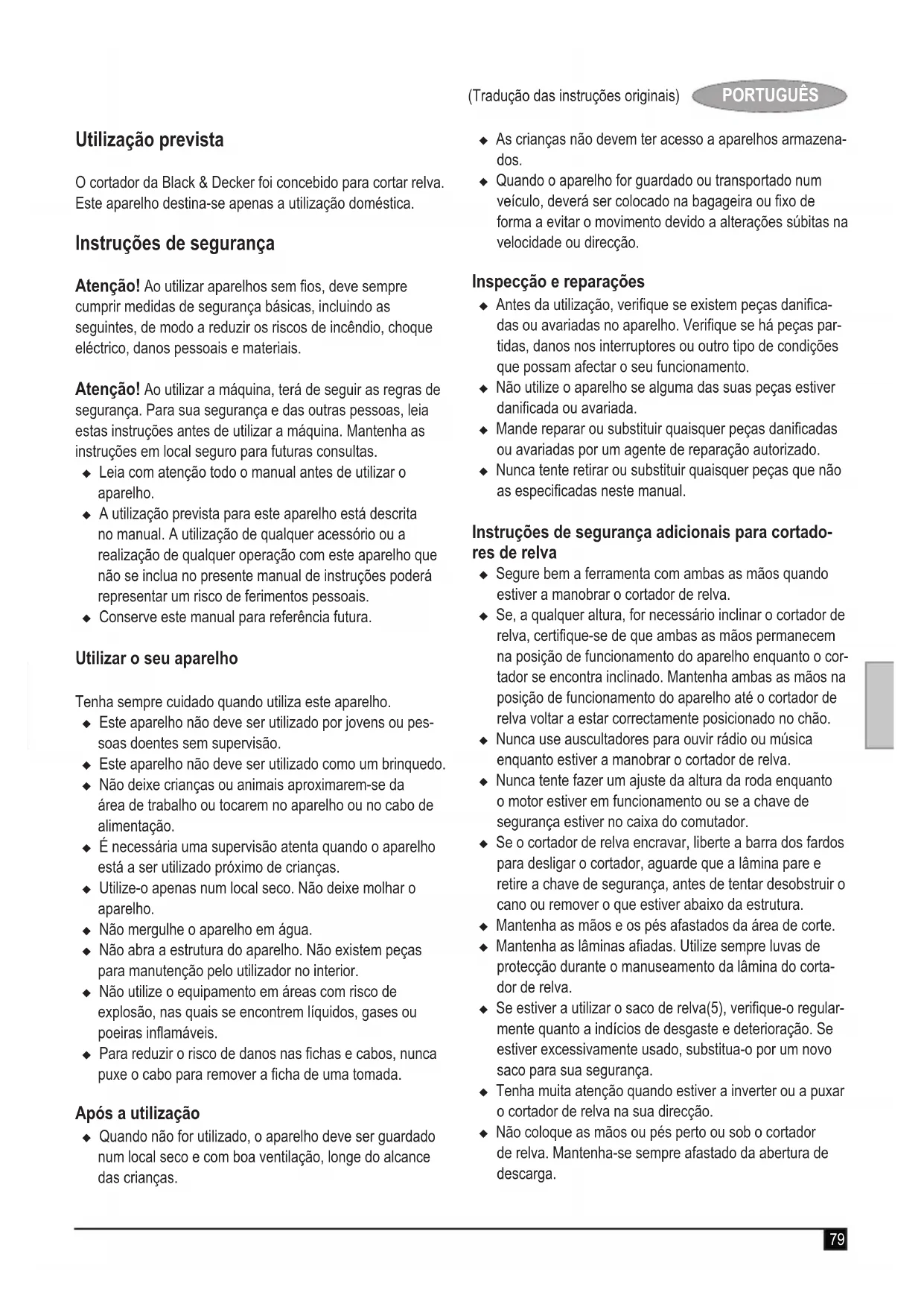 (potencia acústica garantizada) 95 dB(A)incertidumbre (K) = 2 dB(A)Estos productos también cumplen con la directiva 2004/108/CE & 2011/65/EU.Si desea obtener más información, póngase en contacto con Black & Decker a través de la siguiente dirección o consulte el dorso del manual.La persona que rma a continuación es responsable de la elaboración del archivo técnico y realiza esta declaración en nombre de Black & Decker. Kevin HewittVicepresidente de Ingeniería globalBlack & Decker Europe, 210 Bath Road, Slough,Berkshire, SL1 3YDReino Unido01-10-200978 (Traducción de las instrucciones originales) ESPAÑOL Garantía Black & Decker confía plenamente en la calidad de sus pro- ductos y ofrece una garantía extraordinaria. Esta declaración de garantía es un añadido, y en ningún caso un perjuicio para sus derechos legales. La garantía es válida dentro de los territorios de los Estados miembros de la Unión Europea y de los de la Zona Europea de Libre Comercio. Si un producto Black & Decker resultara defectuoso debido a materiales o mano de obra defectuosos o a la falta de confor- midad, Black & Decker garantiza, dentro de los 24 meses de la fecha de compra, la sustitución de las piezas defectuosas, la reparación de los productos sujetos a un desgaste y rotura razonables o la sustitución de tales productos para garantizar al cliente el mínimo de inconvenientes, a menos que: u El producto se ha utilizado con propósitos comerciales, profesionales o de alquiler. u El producto se ha sometido a un uso inadecuado o negli- gente. u El producto ha sufrido daños causados por objetos o sustancias extrañas o accidentes. u Se hayan realizado reparaciones por parte de personas que no sean del servicio técnico autorizado o personal de servicios de Black & Decker. Para reclamar en garantía, será necesario que presente la prueba de compra al vendedor o al agente de servicio técnico autorizado. Puede consultar la dirección de su agente de servicio técnico más cercano si se pone en contacto con la ocina local de Black & Decker en la dirección que se indica en este manual. Como opción alternativa, puede consultar la lista de los agentes de servicio técnico autorizados de Black & Decker y obtener la información completa de nuestros servi- cios de posventa y los contactos disponibles en la siguiente dirección de Internet: www.2helpU.com Visite el sitio web www.blackanddecker.es para registrar su nuevo producto Black & Decker y estar al día sobre productos y ofertas especiales. Encontrará información adicional sobre la marca Black & Decker y nuestra gama de productos en www.blackanddecker.es.79 (Tradução das instruções originais) PORTUGUÊS Utilização prevista O cortador da Black & Decker foi concebido para cortar relva. Este aparelho destina-se apenas a utilização doméstica. Instruções de segurança Atenção! Ao utilizar aparelhos sem os, deve sempre cumprir medidas de segurança básicas, incluindo as seguintes, de modo a reduzir os riscos de incêndio, choque eléctrico, danos pessoais e materiais. Atenção! Ao utilizar a máquina, terá de seguir as regras de segurança. Para sua segurança e das outras pessoas, leia estas instruções antes de utilizar a máquina. Mantenha as instruções em local seguro para futuras consultas. u Leia com atenção todo o manual antes de utilizar o aparelho. u A utilização prevista para este aparelho está descrita no manual. A utilização de qualquer acessório ou a realização de qualquer operação com este aparelho que não se inclua no presente manual de instruções poderá representar um risco de ferimentos pessoais. u Conserve este manual para referência futura. Utilizar o seu aparelho Tenha sempre cuidado quando utiliza este aparelho. u Este aparelho não deve ser utilizado por jovens ou pes- soas doentes sem supervisão. u Este aparelho não deve ser utilizado como um brinquedo. u Não deixe crianças ou animais aproximarem-se da área de trabalho ou tocarem no aparelho ou no cabo de alimentação. u É necessária uma supervisão atenta quando o aparelho está a ser utilizado próximo de crianças. u Utilize-o apenas num local seco. Não deixe molhar o aparelho. u Não mergulhe o aparelho em água. u Não abra a estrutura do aparelho. Não existem peças para manutenção pelo utilizador no interior. u Não utilize o equipamento em áreas com risco de explosão, nas quais se encontrem líquidos, gases ou poeiras inamáveis. u Para reduzir o risco de danos nas chas e cabos, nunca puxe o cabo para remover a cha de uma tomada. Após a utilização u Quando não for utilizado, o aparelho deve ser guardado num local seco e com boa ventilação, longe do alcance das crianças. u As crianças não devem ter acesso a aparelhos armazena- dos. u Quando o aparelho for guardado ou transportado num veículo, deverá ser colocado na bagageira ou xo de forma a evitar o movimento devido a alterações súbitas na velocidade ou direcção. Inspecção e reparações u Antes da utilização, verique se existem peças danica- das ou avariadas no aparelho. Verique se há peças par- tidas, danos nos interruptores ou outro tipo de condições que possam afectar o seu funcionamento. u Não utilize o aparelho se alguma das suas peças estiver danicada ou avariada. u Mande reparar ou substituir quaisquer peças danicadas ou avariadas por um agente de reparação autorizado. u Nunca tente retirar ou substituir quaisquer peças que não as especicadas neste manual. Instruções de segurança adicionais para cortado- res de relva u Segure bem a ferramenta com ambas as mãos quando estiver a manobrar o cortador de relva. u Se, a qualquer altura, for necessário inclinar o cortador de relva, certique-se de que ambas as mãos permanecem na posição de funcionamento do aparelho enquanto o cor- tador se encontra inclinado. Mantenha ambas as mãos na posição de funcionamento do aparelho até o cortador de relva voltar a estar correctamente
