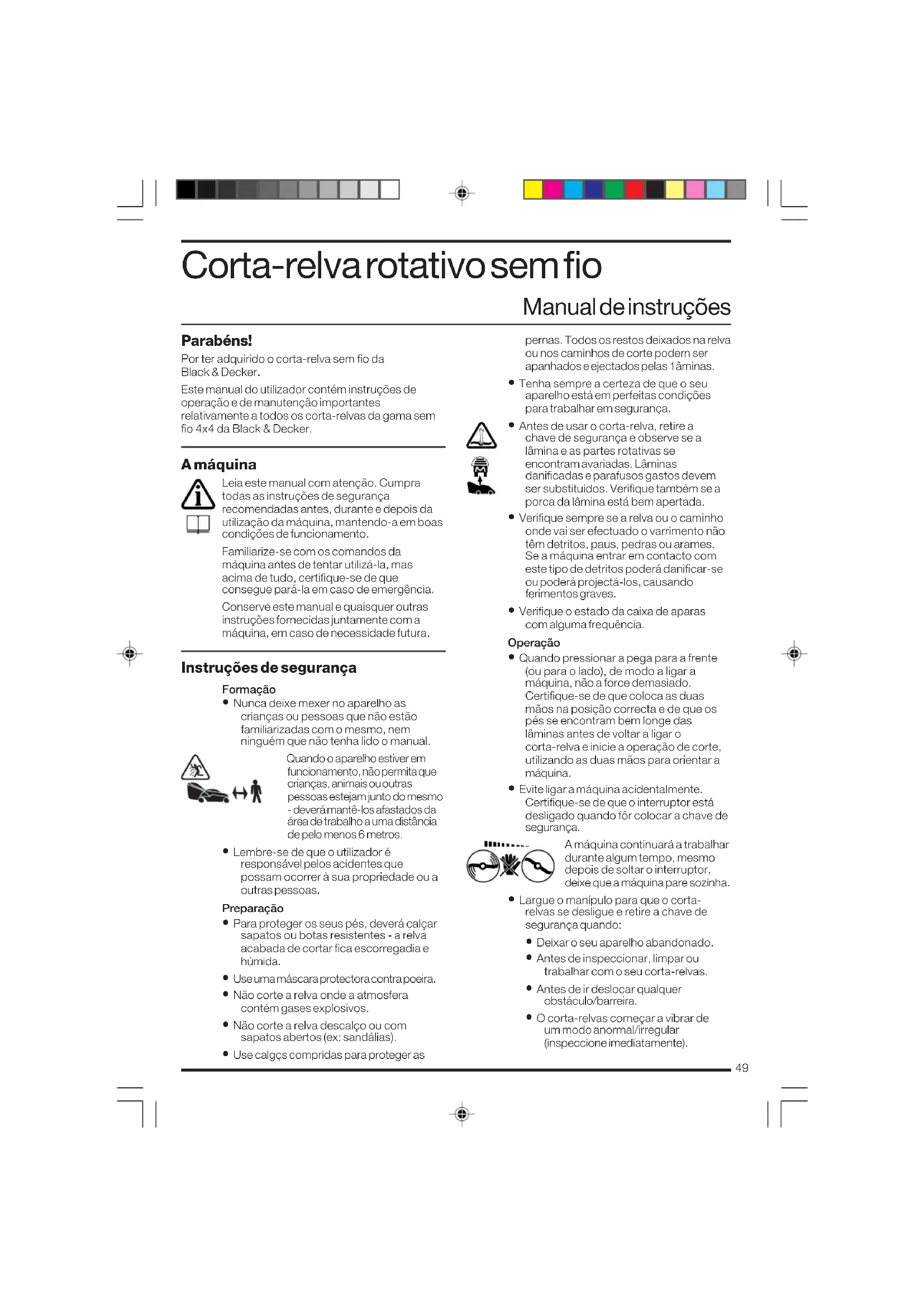 (garantizado) dB(A) 96 Valor cuadrático medio ponderado en frecuencia de la aceleración según EN 50144: Brian Cooke Director de Ingeniería Spennymoor, County Durham DL16 6JG, United Kingdom 1-12-200149 Corta-relva rotativo sem fio Manual de instruções Parabéns! Por ter adquirido o corta-relva sem fio da Black & Decker. Este manual do utilizador contém instruções de operação e de manutenção importantes relativamente a todos os corta-relvas da gama sem fio 4x4 da Black & Decker. A máquina Leia este manual com atenção. Cumpra todas as instruções de segurança recomendadas antes, durante e depois da utilização da máquina, mantendo-a em boas condições de funcionamento. Familiarize-se com os comandos da máquina antes de tentar utilizá-la, mas acima de tudo, certifique-se de que consegue pará-la em caso de emergência. Conserve este manual e quaisquer outras instruções fornecidas juntamente com a máquina, em caso de necessidade futura. Instruções de segurança Formação