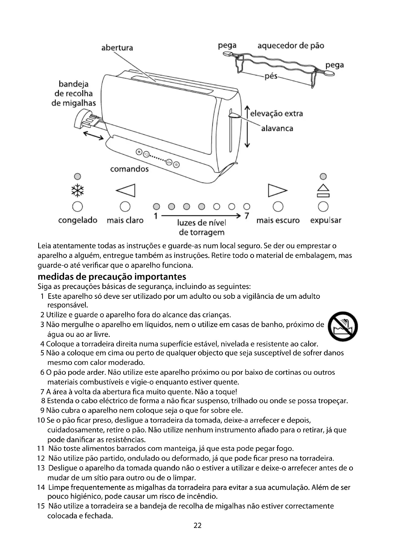 | Características técnicas | Torradeira de 2 fatias com função de descongelamento e reaquecimento |
