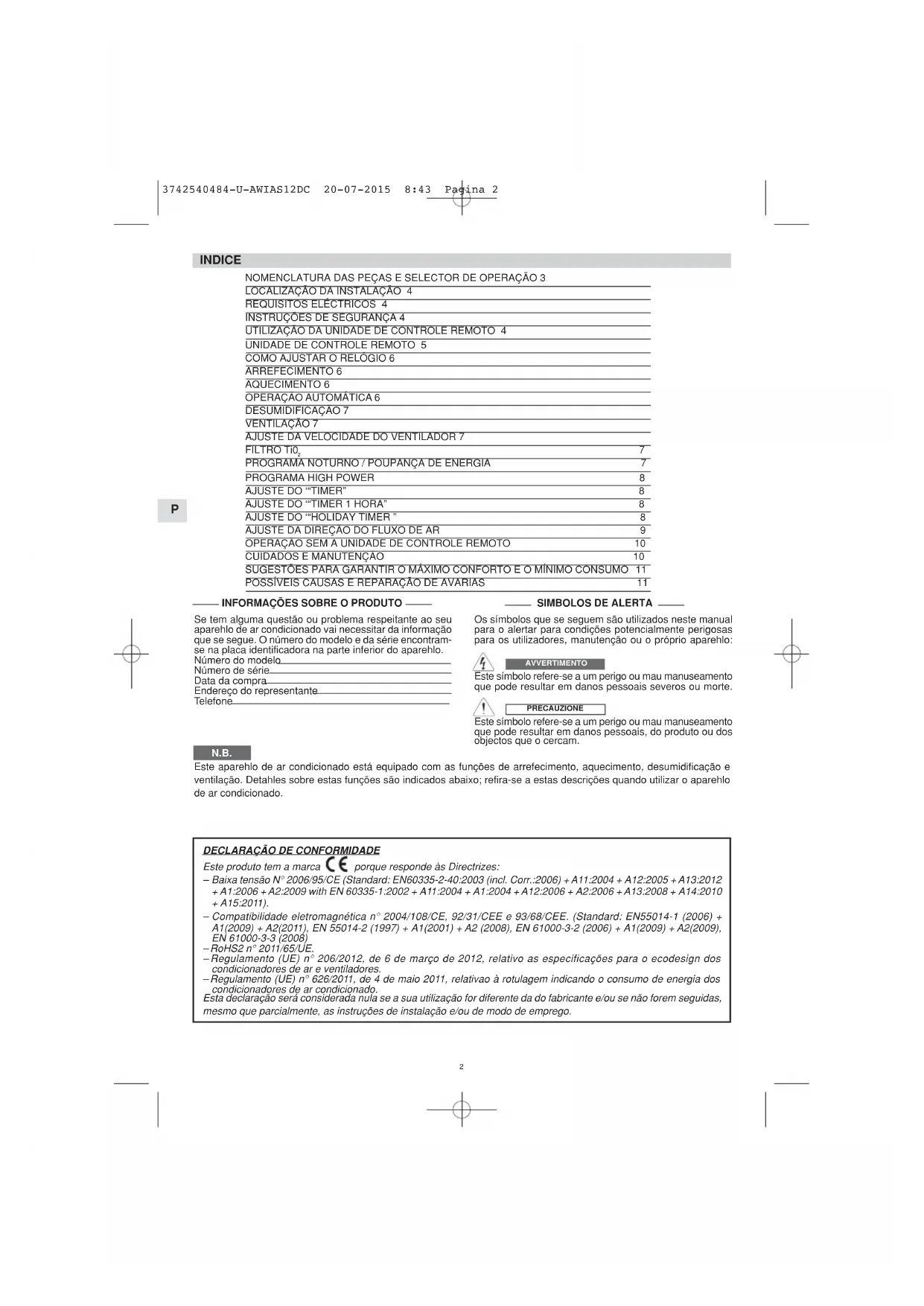 Este produto tem a marca porque responde às Directrizes: – Baixa tensão N° 2006/95/CE (Standard: EN60335-2-40:2003 (incl. Corr.:2006) + A11:2004 + A12:2005 + A13:2012 + A1:2006 + A2:2009 with EN 60335-1:2002 + A11:2004 + A1:2004 + A12:2006 + A2:2006 + A13:2008 + A14:2010 + A15:2011). – Compatibilidade eletromagnética n° 2004/108/CE, 92/31/CEE e 93/68/CEE. (Standard: EN55014-1 (2006) + A1(2009) + A2(2011), EN 55014-2 (1997) + A1(2001) + A2 (2008), EN 61000-3-2 (2006) + A1(2009) + A2(2009), EN 61000-3-3 (2008) – RoHS2 n° 2011/65/UE. –Regulamento (UE) n° 206/2012, de 6 de março de 2012, relativo as especificações para o ecodesign dos condicionadores de ar e ventiladores. – Regulamento (UE) n° 626/2011, de 4 de maio 2011, relativao à rotulagem indicando o consumo de energia dos condicionadores de ar condicionado. Esta declaração será considerada nula se a sua utilização for diferente da do fabricante e/ou se não forem seguidas, mesmo que parcialmente, as instruções de instalação e/ou de modo de emprego. 3742540484-U-AWIAS12DC 20-07-2015 8:43 Pagina 2P