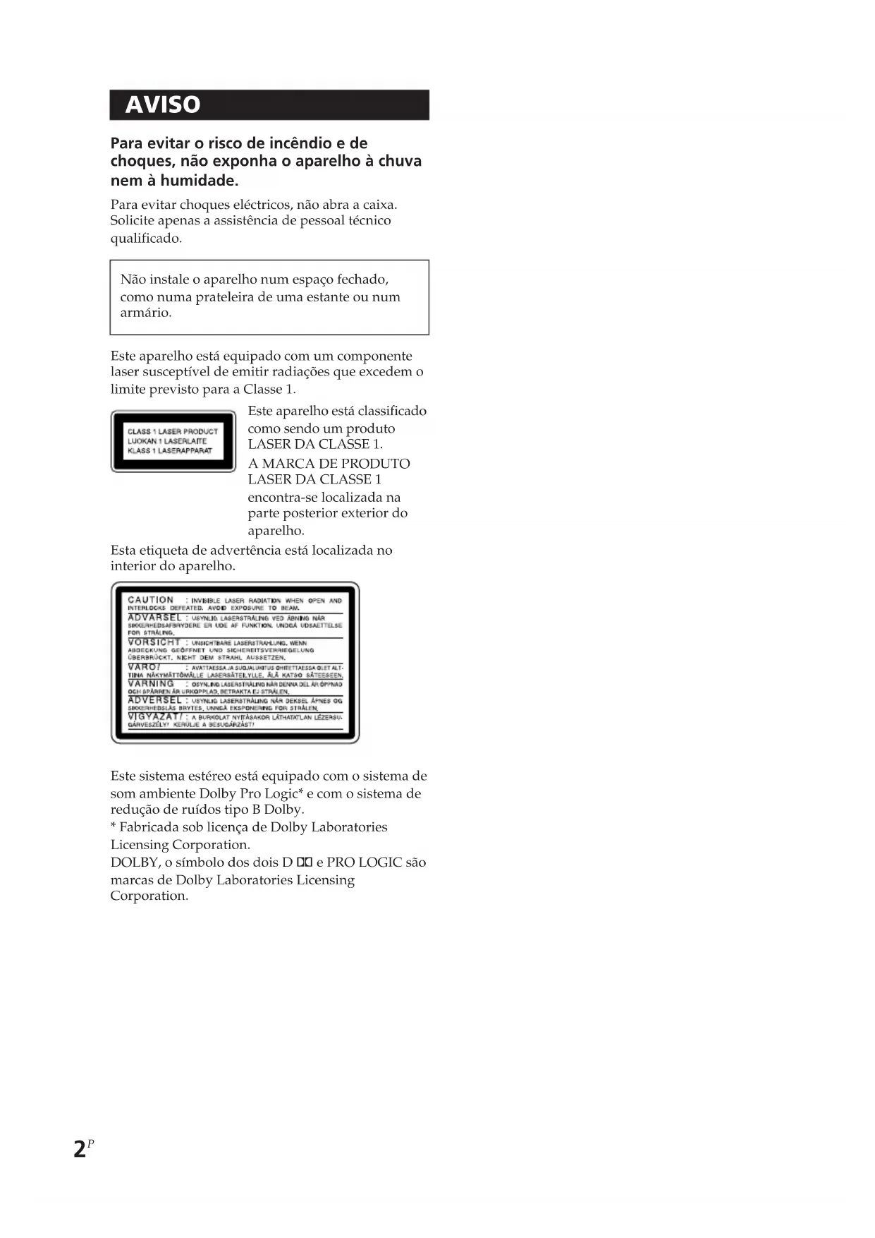 AVISO Para evitar o risco de incêndio e de choques, não exponha o aparelho à chuva nem à humidade. Para evitar choques eléctricos, não abra a caixa. Solicite apenas a assistência de pessoal técnico qualificado. Não instale o aparelho num espaço fechado, como numa prateleira de uma estante ou num armário. Este aparelho está equipado com um componente laser susceptível de emitir radiações que excedem o limite previsto para a Classe 1. Esta etiqueta de advertência está localizada no interior do aparelho. Este sistema estéreo está equipado com o sistema de som ambiente Dolby Pro Logic* e com o sistema de redução de ruídos tipo B Dolby.