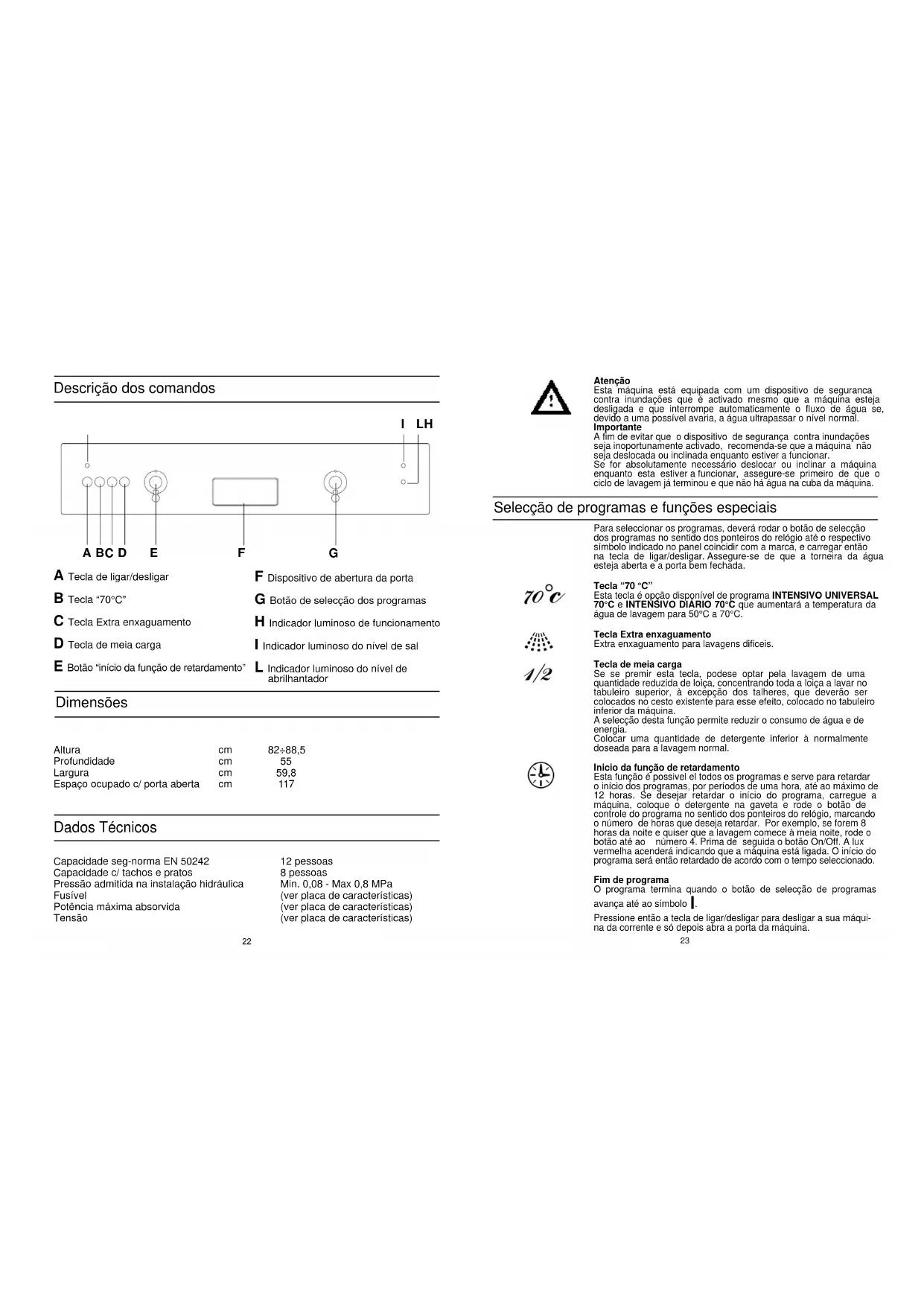 Dimensões Capacidade seg-norma EN 50242 Capacidade c/ tachos e pratos Pressão admitida na instalação hidráulica Fusível Potência máxima absorvida Tensão 12 pessoas 8 pessoas Min. 0,08 - Max 0,8 MPa (ver placa de características) (ver placa de características) (ver placa de características) Altura Profundidade Largura Espaço ocupado c/ porta aberta Descrição dos comandos Dados Técnicos A Tecla de ligar/desligar B Tecla “70°C” C Tecla Extra enxaguamento D Tecla de meia carga E Botão “início da função de retardamento” F Dispositivo de abertura da porta G Botão de selecção dos programas H Indicador luminoso de funcionamento I Indicador luminoso do nível de sal L Indicador luminoso do nível de abrilhantador