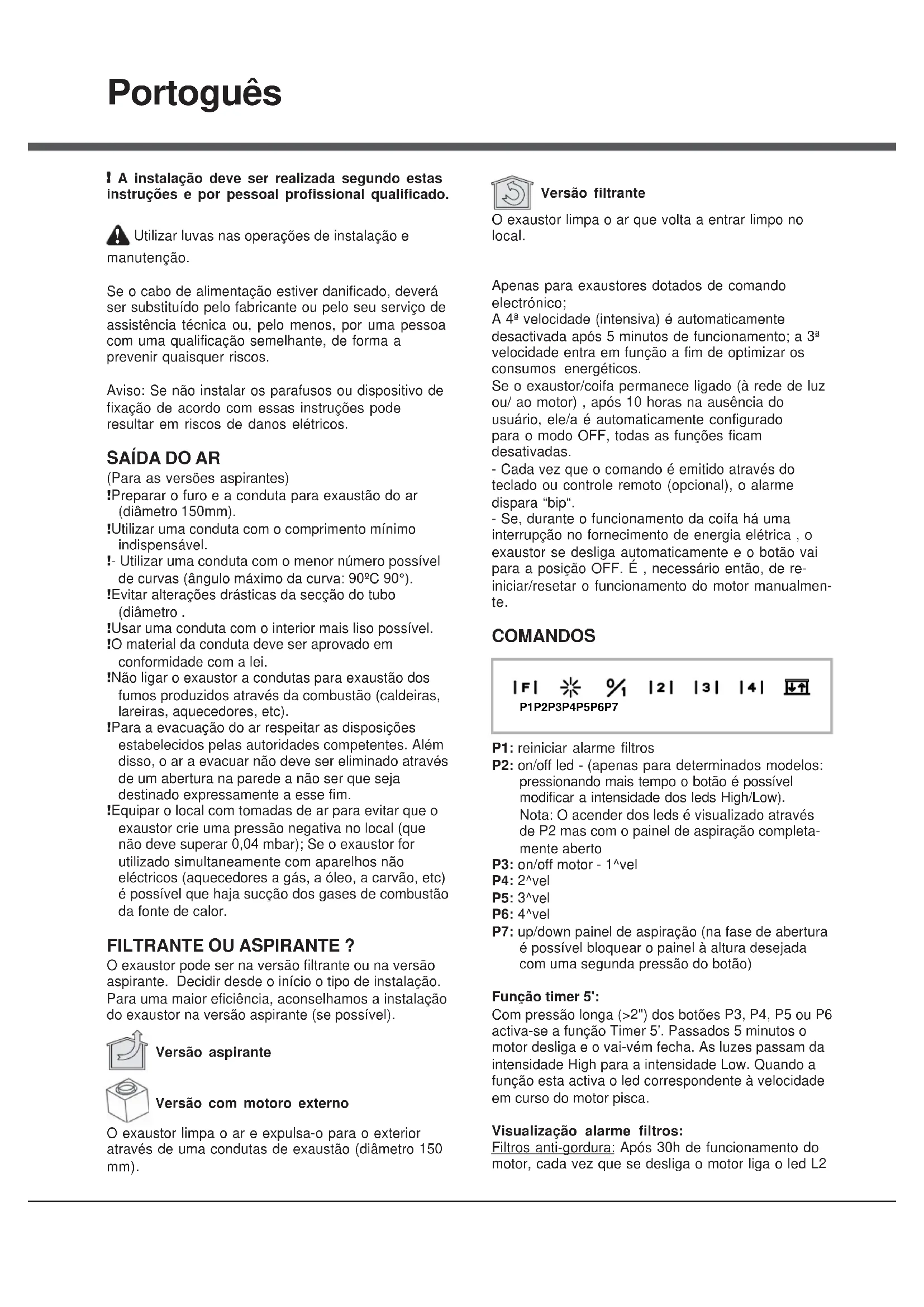 (Para as versões aspirantes) ! Preparar o furo e a conduta para exaustão do ar (diâmetro 150mm). ! Utilizar uma conduta com o comprimento mínimo indispensável. ! - Utilizar uma conduta com o menor número possível de curvas (ângulo máximo da curva: 90ºC 90°). ! Evitar alterações drásticas da secção do tubo (diâmetro . ! Usar uma conduta com o interior mais liso possível. ! O material da conduta deve ser aprovado em conformidade com a lei. ! Não ligar o exaustor a condutas para exaustão dos fumos produzidos através da combustão (caldeiras, lareiras, aquecedores, etc). ! Para a evacuação do ar respeitar as disposições estabelecidos pelas autoridades competentes. Além disso, o ar a evacuar não deve ser eliminado através de um abertura na parede a não ser que seja destinado expressamente a esse fim. ! Equipar o local com tomadas de ar para evitar que o exaustor crie uma pressão negativa no local (que não deve superar 0,04 mbar); Se o exaustor for utilizado simultaneamente com aparelhos não eléctricos (aquecedores a gás, a óleo, a carvão, etc) é possível que haja sucção dos gases de combustão da fonte de calor. FILTRANTE OU ASPIRANTE ? O exaustor pode ser na versão filtrante ou na versão aspirante. Decidir desde o início o tipo de instalação. Para uma maior eficiência, aconselhamos a instalação do exaustor na versão aspirante (se possível). Versão aspirante Versão com motoro externo O exaustor limpa o ar e expulsa-o para o exterior através de uma condutas de exaustão (diâmetro 150 mm). Versão filtrante O exaustor limpa o ar que volta a entrar limpo no local. Apenas para exaustores dotados de comando electrónico; A 4ª velocidade (intensiva) é automaticamente desactivada após 5 minutos de funcionamento; a 3ª velocidade entra em função a fim de optimizar os consumos energéticos. Se o exaustor/coifa permanece ligado (à rede de luz ou/ ao motor) , após 10 horas na ausência do usuário, ele/a é automaticamente configurado para o modo OFF, todas as funções ficam desativadas. - Cada vez que o comando é emitido através do teclado ou controle remoto (opcional), o alarme dispara “bip“. - Se, durante o funcionamento da coifa há uma interrupção no fornecimento de energia elétrica , o exaustor se desliga automaticamente e o botão vai para a posição OFF. É , necessário então, de re- iniciar/resetar o funcionamento do motor manualmen- te. COMANDOS P1 P2 P3 P4 P5 P6 P7 P1: reiniciar alarme filtros P2: on/off led - (apenas para determinados modelos: pressionando mais tempo o botão é possível modificar a intensidade dos leds High/Low). Nota: O acender dos leds é visualizado através de P2 mas com o painel de aspiração completa- mente aberto P3: on/off motor - 1^vel P4: 2^vel P5: 3^vel P6: 4^vel P7: up/down painel de aspiração (na fase de abertura é possível bloquear o painel à altura desejada com uma segunda pressão do botão) Função timer 5': Com pressão longa (>2") dos botões P3, P4, P5 ou P6 activa-se a função Timer 5'. Passados 5 minutos o motor desliga e o vai-vém fecha. As luzes passam da intensidade High para a intensidade Low. Quando a função esta activa o led correspondente à velocidade em curso do motor pisca. Visualização alarme filtros: Filtros anti-gordura: Após 30h de funcionamento do motor, cada vez que se desliga o motor liga o led L2NL (vermelho fixo) durante 30''. Filtro de carvão: Após 120h de funcionamento do motor, cada vez que se desliga o motor o led do botão P1 pisca durante 30''. COMANDOS P1: reiniciar alarme filtros P2: on/off motor - 1^vel P3: 2^vel P4: 3^vel P5: 4^vel P6: up/down painel de aspiração (na fase de abertura é possível bloquear o painel à altura desejada com uma segunda pressão do botão) Função timer 5': Com pressão longa (>2") dos botões P2, P3, P4 ou P5 activa-se a função Timer 5'. Passados 5 minutos o motor desliga e o vai-vém fecha. As luzes passam da intensidade High para a intensidade Low. Quando a função esta activa o led correspondente à velocidade em curso do motor pisca. Visualização alarme filtros: Filtros anti-gordura: Após 30h de funcionamento do motor, cada vez que se desliga o motor liga o led L2 (vermelho fixo) durante 30''. Filtro de carvão: Após 120h de funcionamento do motor, cada vez que se desliga o motor o led do botão P1 pisca durante 30''. COMANDOS P1: on/off motor - 1^vel P2: 2^vel P3: 3^vel P4: 4^vel P5: up/down painel de aspiração (na fase de abertura é possível bloquear o painel à altura desejada com uma segunda pressão do botão) Função timer 5': Com o motor ligado e uma pressão longa nos botões P1-P4 (em função da velocidade configurada), activa- se a função Timer 5'. Quando esta função está activa o led correspondente à velocidade (L1-L4) pisca. Passados 5' minutos o motor desliga e o carrinho fecha. Visualização alarme filtros: Após 30h de funcionamento do motor, cada vez que se desliga o motor os leds L1-L5 acendem durante 30''. Após 120h de funcionamento do motor, cada vez que se desliga o motor os leds L1-L5 piscam durante 30''. Para fazer o RESET do alarme deve-se premir um dos botões P1-P5 por 2" durante a visualização do alarme.