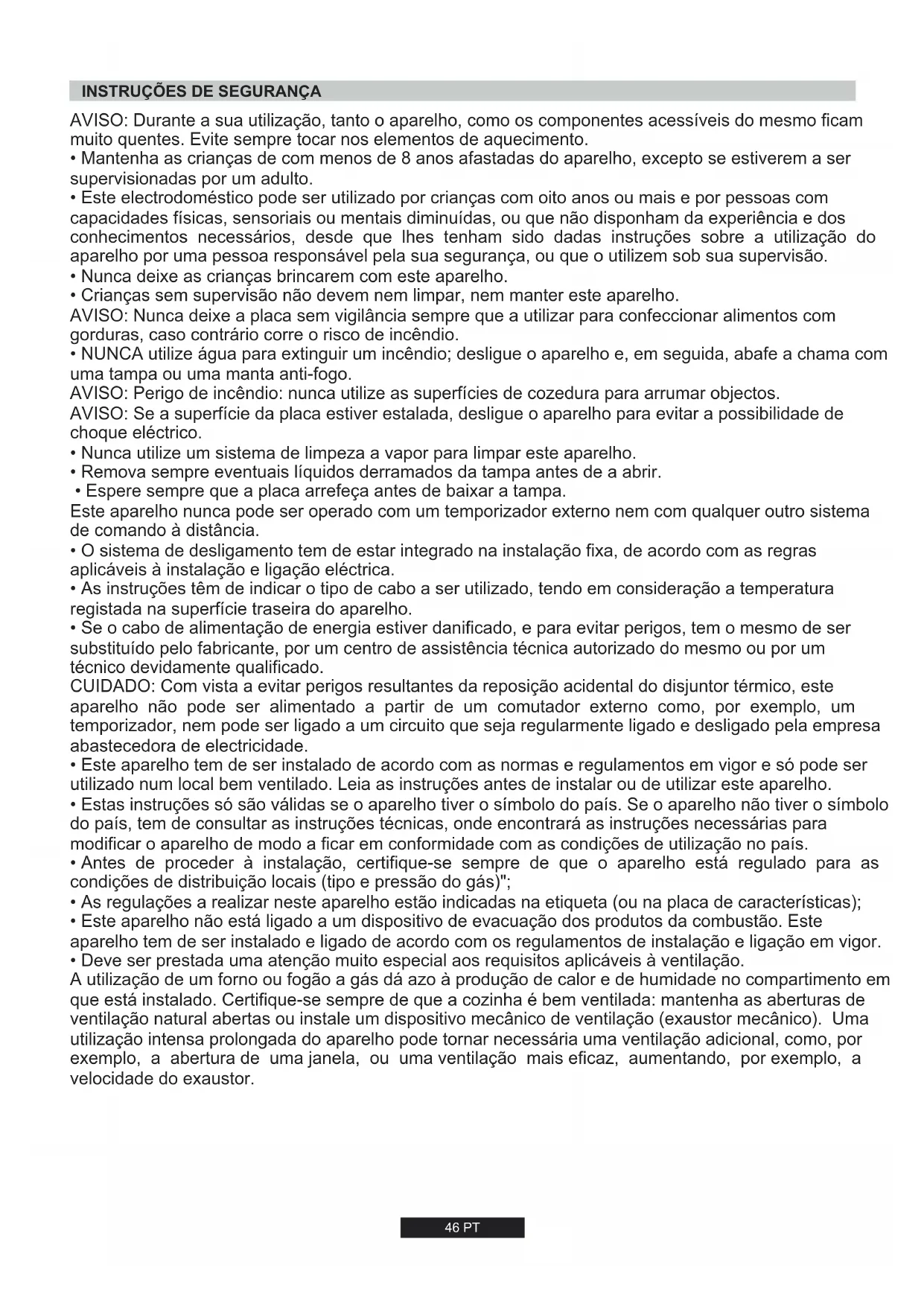 - Crianças sem supervisão não devem nem limpar, nem manter este aparelho. AVISO: Nunca deixe a placa sem vigilância sempre que a utilizar para confeccionar alimentos com gorduras, caso contrário corre o risco de incêndio.