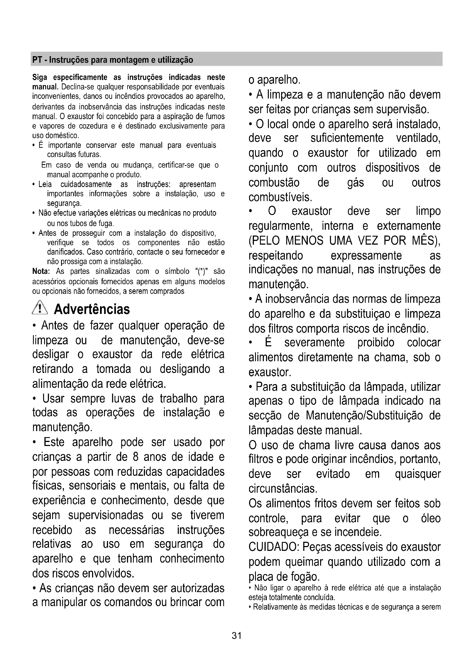 - Para a substituição da lâmpada, utilizar apenas o tipo de lâmpada indicado na secção de Manutenção/Substituição de lâmpadas deste manual. O uso de chama livre causa danos aos filtros e pode originar incêndios, portanto, deve ser evitado em quaisquer circunstâncias. Os alimentos fritos devem ser feitos sob controle, para evitar que o óleo sobreaqueça e se incendeie. CUIDADO: Peças acessíveis do exaustor podem queimar quando utilizado com a placa de fogão.