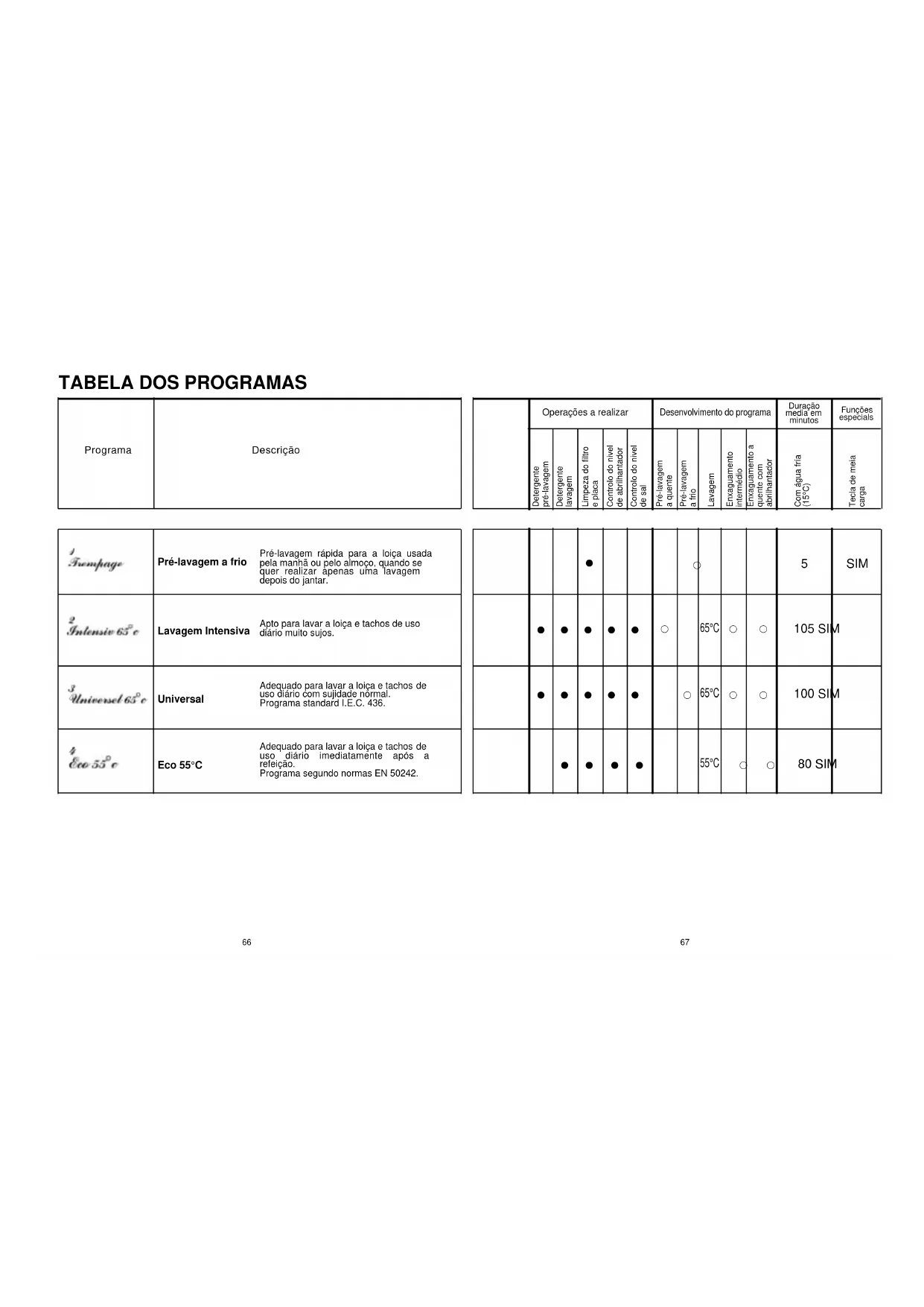 65°C Detergente pré-lavagemDetergente lavagemLimpeza do filtro e placaControlo do nivel de abrilhantadorControlo do nivel de salPré-lavagem a quentePré-lavagema frioLavagemEnxaguamentointermédioEnxaguamento aquente comabrilhantadorCom água fría (15°C)Tecla de meiacarga Operações a realizar Desenvolvimento do programa Duraçãomedia emminutosFunçõesespecials