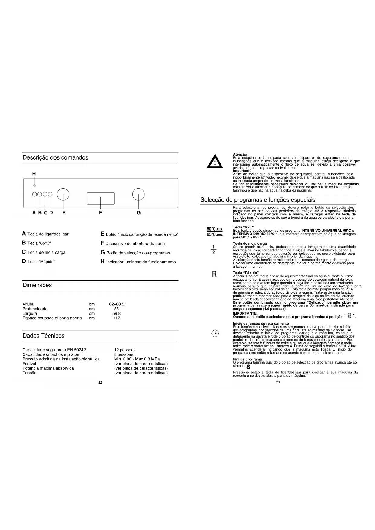Dimensões Capacidade seg-norma EN 50242 Capacidade c/ tachos e pratos Pressão admitida na instalação hidráulica Fusível Potência máxima absorvida Tensão 12 pessoas 8 pessoas Min. 0,08 - Max 0,8 MPa (ver placa de características) (ver placa de características) (ver placa de características) Altura Profundidade Largura Espaço ocupado c/ porta aberta Descrição dos comandos Dados Técnicos A Tecla de ligar/desligar B Tecla “65°C” C Tecla de meia carga D Tecla “Rápido” E Botão “início da função de retardamento” F Dispositivo de abertura da porta G Botão de selecção dos programas H Indicador luminoso de funcionamento