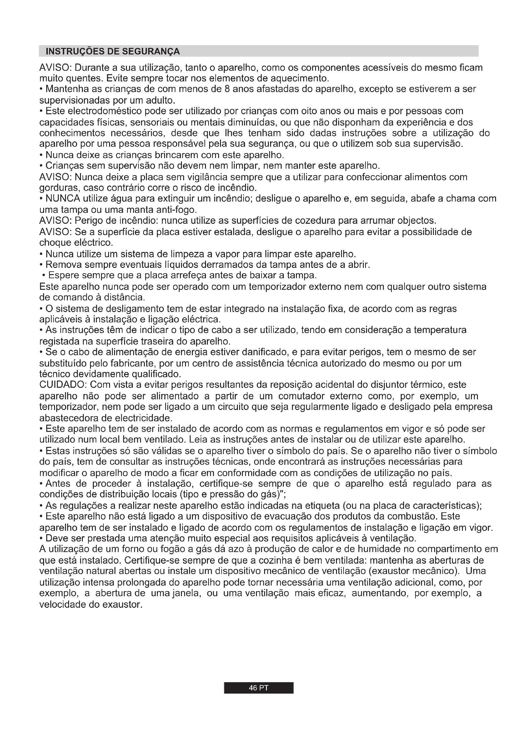 46 PT AVISO: Durante a sua utilização, tanto o aparelho, como os componentes acessíveis do mesmo ficam muito quentes. Evite sempre tocar nos elementos de aquecimento.