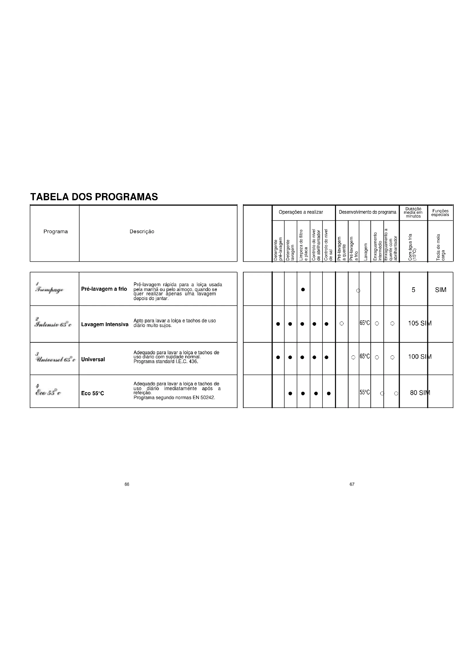 65°C Detergente pré-lavagemDetergente lavagemLimpeza do filtro e placaControlo do nivel de abrilhantadorControlo do nivel de salPré-lavagem a quentePré-lavagema frioLavagemEnxaguamentointermédioEnxaguamento aquente comabrilhantadorCom água fría (15°C)Tecla de meiacarga Operações a realizar Desenvolvimento do programa Duraçãomedia emminutosFunçõesespecials