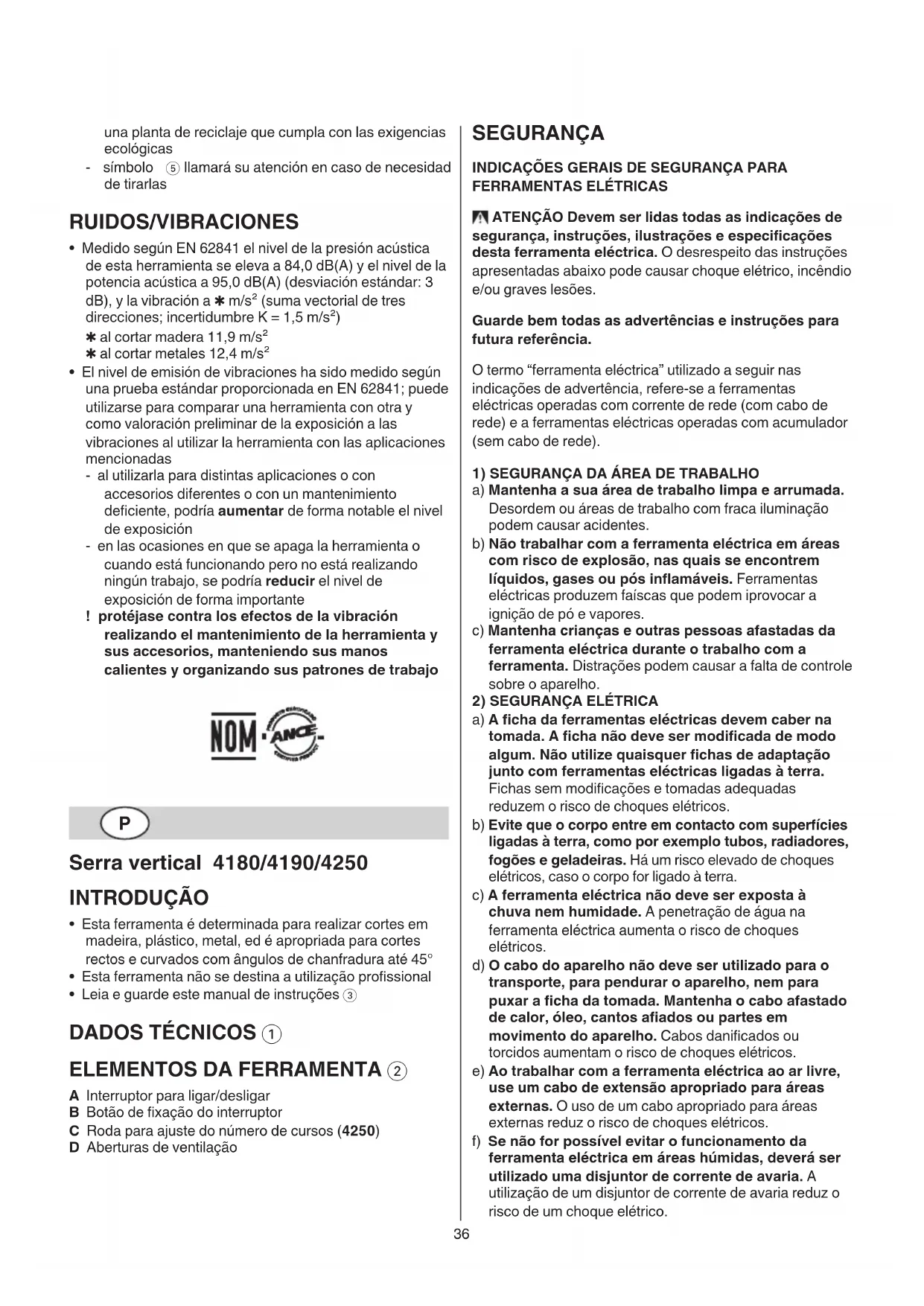A Interruptor para ligar/desligar B Botão de xação do interruptor C Roda para ajuste do número de cursos (4250) D Aberturas de ventilação SEGURANÇA INDICAÇÕES GERAIS DE SEGURANÇA PARA