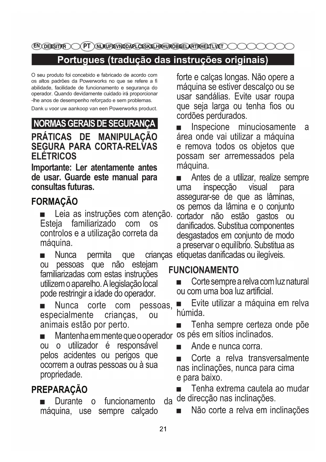 ELÉTRICOS Importante: Ler atentamente antes de usar. Guarde este manual para consultas futuras. FORMAÇÃO ■ Leia as instruções com atenção. Esteja familiarizado com os controlos e a utilização correta da máquina. ■ Nunca permita que crianças ou pessoas que não estejam familiarizadas com estas instruções utilizem o aparelho. A legislação local pode restringir a idade do operador. ■ Nunca corte com pessoas, especialmente crianças, ou animais estão por perto. ■ Mantenha em mente que o operador ou o utilizador é responsável pelos acidentes ou perigos que ocorrem a outras pessoas ou à sua propriedade. PREPARAÇÃO ■ Durante o funcionamento da máquina, use sempre calçado forte e calças longas. Não opere a máquina se estiver descalço ou se usar sandálias. Evite usar roupa que seja larga ou tenha fios ou cordões perdurados. ■ Inspecione minuciosamente a área onde vai utilizar a máquina e remova todos os objetos que possam ser arremessados pela máquina. ■ Antes de a utilizar, realize sempre uma inspecção visual para assegurar-se de que as lâminas, os pernos da lâmina e o conjunto cortador não estão gastos ou danificados. Substitua componentes desgastados em conjunto de modo a preservar o equilíbrio. Substitua as etiquetas danificadas ou ilegíveis. FUNCIONAMENTO ■ Corte sempre a relva com luz natural ou com uma boa luz artificial. ■ Evite utilizar a máquina em relva húmida. ■ Tenha sempre certeza onde põe os pés em sítios inclinados. ■ Ande e nunca corra. ■ Corte a relva transversalmente nas inclinações, nunca para cima e para baixo. ■ Tenha extrema cautela ao mudar de direcção nas inclinações. ■ Não corte a relva em inclinações 21Portugues (tradução das instruções originais)