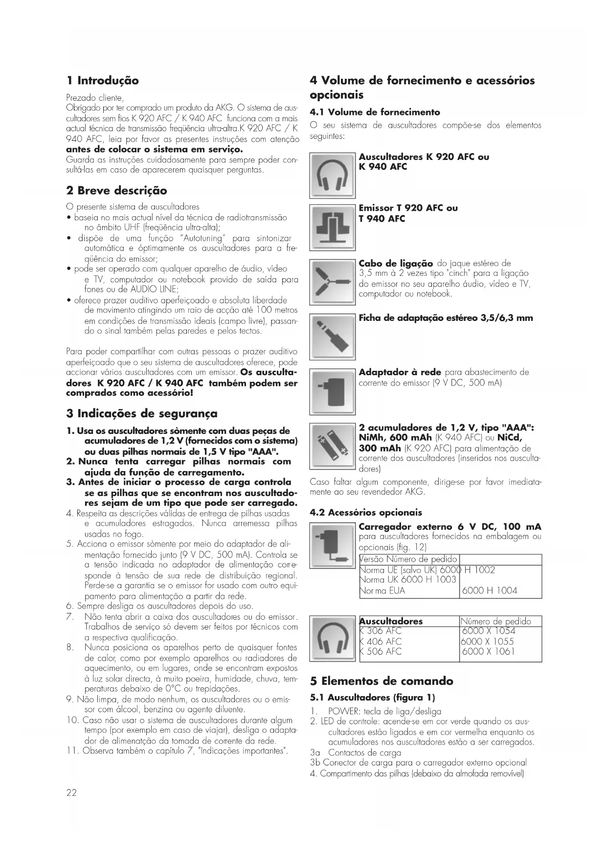 Falla No hay sonido El LED indicador de la función de carga no emite luz Transmisión en mono Ruidos fuertes Sonido distorsionado22 1 Introdução Prezado cliente, Obrigado por ter comprado um produto da AKG. O sistema de aus- cultadores sem fios K 920 AFC / K 940 AFC funciona com a mais actual técnica de transmissão freqüência ultra-altra.K 920 AFC / K 940 AFC, leia por favor as presentes instruções com atenção antes de colocar o sistema em serviço. Guarda as instruções cuidadosamente para sempre poder con- sultá-las em caso de aparecerem quaisquer perguntas. 2 Breve descrição O presente sistema de auscultadores