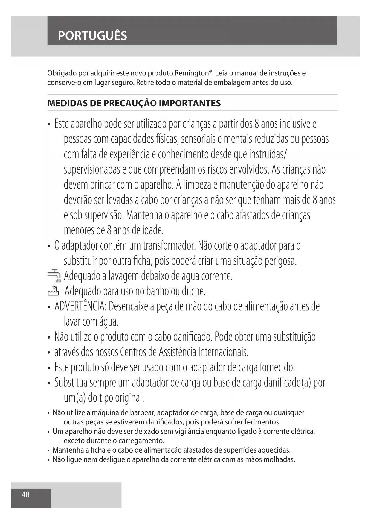 - Este aparelho pode ser utilizado por crianças a partir dos 8 anos inclusive e pessoas com capacidades físicas, sensoriais e mentais reduzidas ou pessoas com falta de experiência e conhecimento desde que instruídas/ supervisionadas e que compreendam os riscos envolvidos. As crianças não devem brincar com o aparelho. A limpeza e manutenção do aparelho não deverão ser levadas a cabo por crianças a não ser que tenham mais de 8 anos e sob supervisão. Mantenha o aparelho e o cabo afastados de crianças menores de 8 anos de idade.