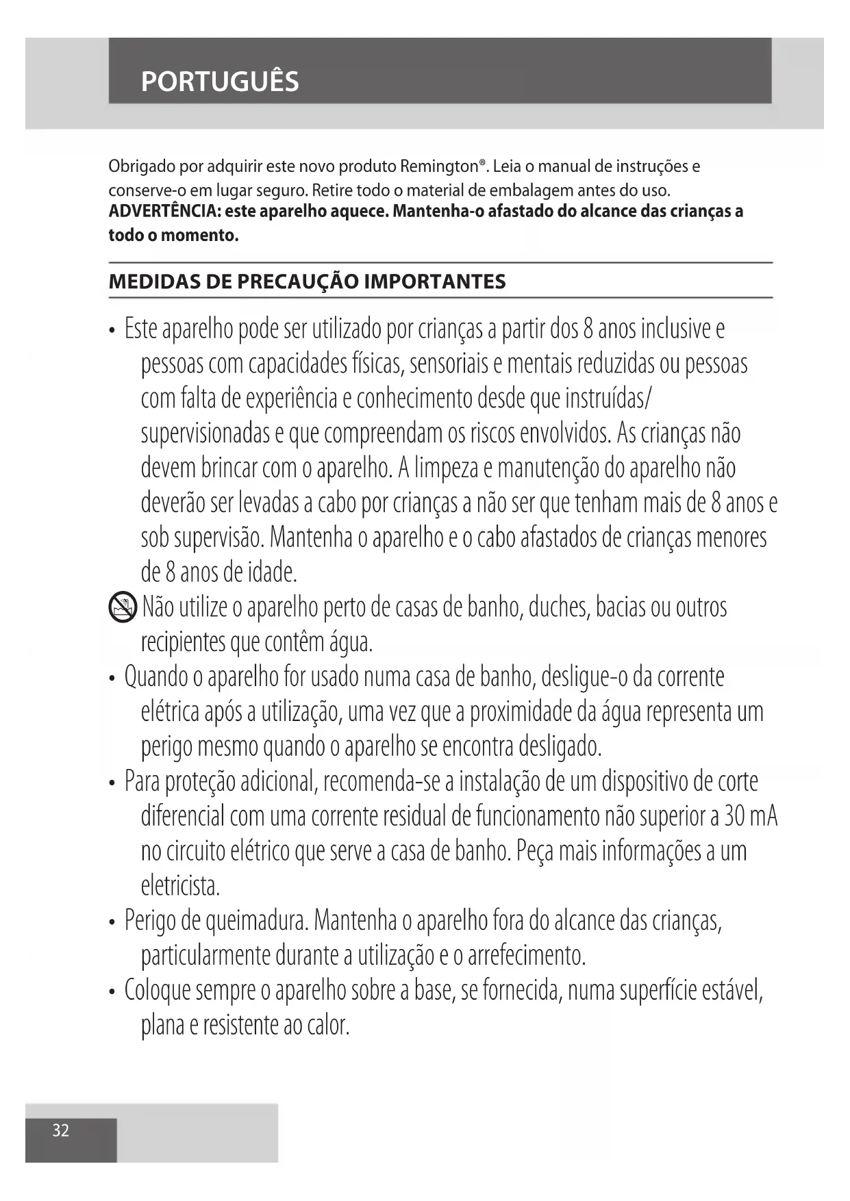 AE32 Obrigado por adquirir este novo produto Remington®. Leia o manual de instruções e conserve-o em lugar seguro. Retire todo o material de embalagem antes do uso. ADVERTÊNCIA: este aparelho aquece. Mantenha-o afastado do alcance das crianças a todo o momento.