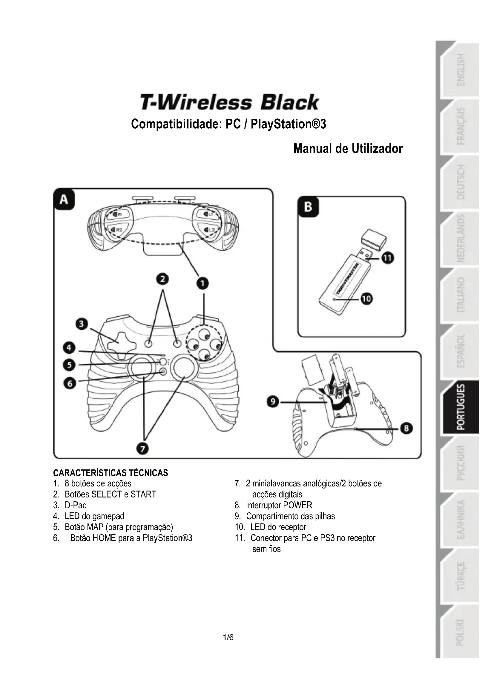 - Não consigo configurar o meu gamepad: - No menu “Options/Controller/Gamepad” do jogo: seleccione a configuração mais adequada. - Para mais informações, consulte o manual de utilizador do jogo ou a ajuda online. - Pode também utilizar a função de “programação” do gamepad para resolver este tipo de problema. Quando acabar de utilizar o gamepad, recomendamos que regule sempre o interruptor POWER do gamepad (9) para a posição OFF (para prolongar a carga das pilhas).4/6 INFORMAÇÕES SOBRE A GARANTIA PARA O CONSUMIDOR A Guillemot Corporation S.A., com sede social sita em Place du Granier, B.P. 97143, 35571 Chantepie, França (a seguir designada como “Guillemot”) garante a nível mundial ao consumidor que este produto Thrustmaster está livre de defeitos em termos de materiais e fabrico durante um período de garantia que corresponde ao limite de tempo para intentar uma ação de conformidade relativamente a este produto. Nos países da União Europeia, isto corresponde a um período de dois (2) anos desde a entrega do produto Thrustmaster. Noutros países, o período de garantia corresponde ao limite de tempo para intentar uma ação de conformidade relativamente ao produto Thrustmaster de acordo com a legislação em vigor do país no qual o consumidor residia à data de compra do produto Thrustmaster (se a dita ação não existir no país correspondente, então o período de garantia será de um (1) ano a partir da data de compra original do produto Thrustmaster. No caso de o produto apresentar algum defeito durante o período da garantia, contacte imediatamente o Suporte Técnico, que lhe indicará o procedimento a tomar. Se esse defeito se confirmar, o produto terá de ser devolvido ao respetivo local de compra (ou qualquer outro local indicado pelo Suporte Técnico). No âmbito da presente garantia, e por opção do Suporte Técnico, o produto defeituoso do consumidor será substituído ou reparado. Se, durante o período da garantia, o produto Thrustmaster for submetido à dita reparação, qualquer período mínimo de (7) dias durante o qual o produto estiver fora de serviço será adicionado ao período da garantia restante (este período decorre desde a data do pedido intervenção pelo consumidor ou desde a data em que o produto em questão é disponibilizado para reparação, se a data em que o produto é disponibilizado para reparação for posterior à data do pedido de intervenção). Se for permitido pela legislação em vigor, a responsabilidade total da Guillemot e das respetivas filiais (incluindo para danos indiretos) está limitada à reparação ou à substituição do produto Thrustmaster. Se for permitido pela legislação em vigor, a Guillemot rejeita todas as garantias de comercialização ou adequação a um fim específico. A presente garantia não se aplicará: (1) se o produto tiver sido modificado, aberto, alterado ou danificado em resultado de utilização inadequada ou abusiva, negligência, acidente, desgaste normal ou qualquer outra casa relacionada com um defeito de material ou fabrico (incluindo, mas sem limitação, combinar o produto Thrustmaster com qualquer elemento inadequado, incluindo, em particular, fontes de alimentação, baterias recarregáveis, carregadores ou quaisquer outros elementos não fornecidos pela Guillemot para este produto); (2) se o produto tiver sido utilizado fora do âmbito da utilização doméstica, incluindo para fins profissionais ou comerciais (salas de jogos, treino e competições, por exemplo); (3) na eventualidade de incumprimento das instruções fornecidas pelo Suporte Técnico; (4) a software, estando o mesmo sujeito a uma garantia específica; (5) a consumíveis (elementos para substituir ao longo da vida útil do produto: baterias descartáveis, auscultadores de áudio ou auriculares de auscultadores, por exemplo); (6) a acessórios (cabos, estojos, bolsas, sacos e correias de pulso, por exemplo); (7) se o produto foi vendido num leilão público. A presente garantia não é transmissível. Os direitos legais do consumidor no que concerne à legislação aplicável à venda de bens de consumo no seu país não são afetados pela presente garantia.5/6 Disposições de garantia adicionais Durante o período da garantia, a Guillemot não fornecerá, em princípio, quaisquer peças de substituição, uma vez que o Suporte Técnico é a única parte autorizada a abrir e/ou reparar qualquer produto Thrustmaster (à exceção de quaisquer procedimentos de reparação que o Suporte Técnico possa pedir ao consumidor para realizar, através de instruções por escrito – por exemplo, devido à simplicidade e à falta de confidencialidade do processo de reparação – e fornecendo ao consumidor a(s) peça(s) de substituição necessária(s), quando aplicável). Tendo em conta os seus ciclos de inovação, e a fim de proteger o seu know-how e segredos comerciais, a Guillemot não fornecerá, em princípio, qualquer notificação de reparação ou peças de substituição para produtos Thrustmaster cujo período da garantia tenha expirado. Responsabilidade Se for permitido ao abrigo da legislação aplicável, a Guillemot Corporation S.A. (a seguir designada “Guillemot”) e as respetivas filiais rejeitam qualquer responsabilidade por danos resultantes de uma ou mais das seguintes causas: (1) o produto foi modificado, aberto ou alterado; (2) incumprimento das instruções de montagem; (3) utilização inadequada ou abusiva, negligência ou acidente (um impacto, por exemplo); (4) desgaste normal; (5) utilização do produto fora do âmbito além da utilização doméstica, incluindo para fins profissionais ou comerciais (salas de jogos, treino e competições, por exemplo). Se for permitido ao abrigo da legislação aplicável, a Guillemot e as respetivas filiais rejeitam qualquer responsabilidade por danos relacionados com um defeito de material ou fabrico relativamente ao produto (incluindo, mas 