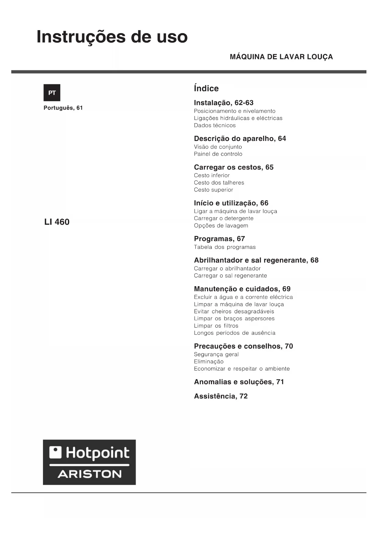 - el número de serie (S/N ). Estas informaciones se encuentran en la placa que está fijada en la parte lateral de la puerta de acero inox (ver Descripción del lavavajilla).MÁQUINA DE LAVAR LOUÇA Índice Instalação, 62-63 Posicionamento e nivelamento Ligações hidráulicas e eléctricas Dados técnicos Descrição do aparelho, 64 Visão de conjunto Painel de controlo Carregar os cestos, 65 Cesto inferior Cesto dos talheres Cesto superior Início e utilização, 66 Ligar a máquina de lavar louça Carregar o detergente Opções de lavagem Programas, 67 Tabela dos programas Abrilhantador e sal regenerante, 68 Carregar o abrilhantador Carregar o sal regenerante Manutenção e cuidados, 69 Excluir a água e a corrente eléctrica Limpar a máquina de lavar louça Evitar cheiros desagradáveis Limpar os braços aspersores Limpar os filtros Longos períodos de ausência Precauções e conselhos, 70 Segurança geral Eliminação Economizar e respeitar o ambiente Anomalias e soluções, 71 Assistência, 72 Português, 61 Instruções de uso LI 460 PT62