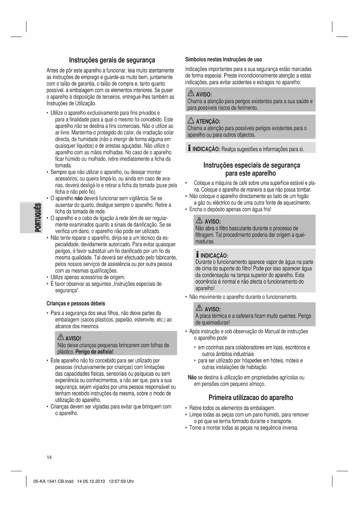 Poupe o nosso meio ambiente, não deite aparelhos eléctricos para o lixo doméstico. Dirija-se ao locais destinados à recolha especial de aparelhos eléctricos e entregue aí os aparelhos que não pretende conti- nuar a utilizar. Desta forma, contribuirá para ajudar a evitar os potenciais efei- tos perniciosos que um falso depósito de objectos usados terão, tanto no que diz respeito ao ambiente, como à saúde humana. Dará igualmente a sua contribuição para o reaproveitamento de materiais, para a reciclagem e outras formas de aproveitamento de aparelhos eléctricos e electrónicos usados. Receberá, nas autarquias e juntas de freguesia, informações sobre os locais onde poderá entregar tais aparelhos. 05-KA 1541 CB.indd 16 05.10.2010 12:58:00 Uhr17