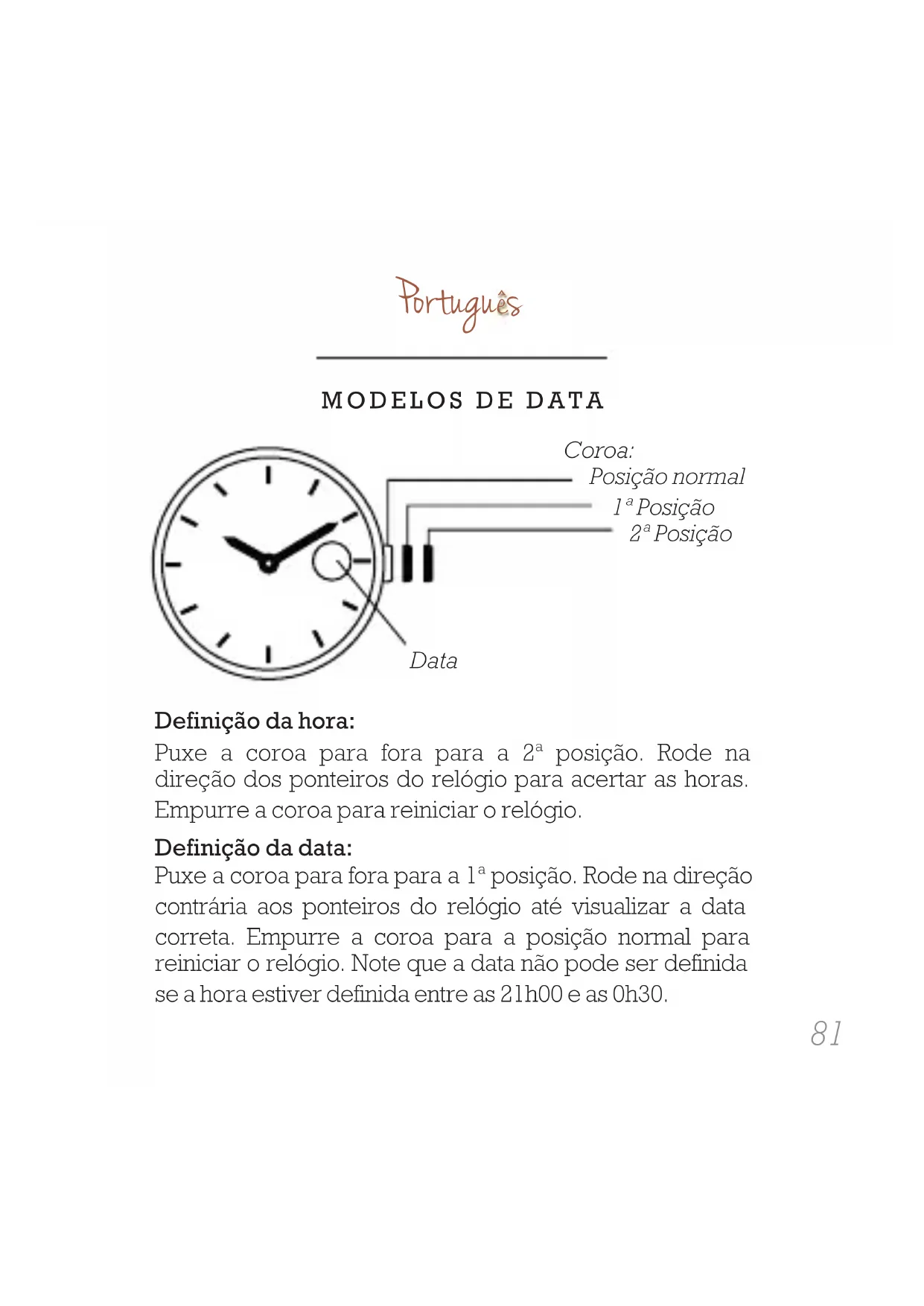 Posição normal 1ª Posição 2ª Posição Data Coroa: Puxe a coroa para fora para a 2ª posição. Rode na direção dos ponteiros do relógio para acertar as horas. Empurre a coroa para reiniciar o relógio. Definição da hora: Puxe a coroa para fora para a 1ª posição. Rode na direção contrária aos ponteiros do relógio até visualizar a data correta. Empurre a coroa para a posição normal para reiniciar o relógio. Note que a data não pode ser definida se a hora estiver definida entre as 21h00 e as 0h30. Definição da data:Posição normal 1ª Posição 2ª Posição