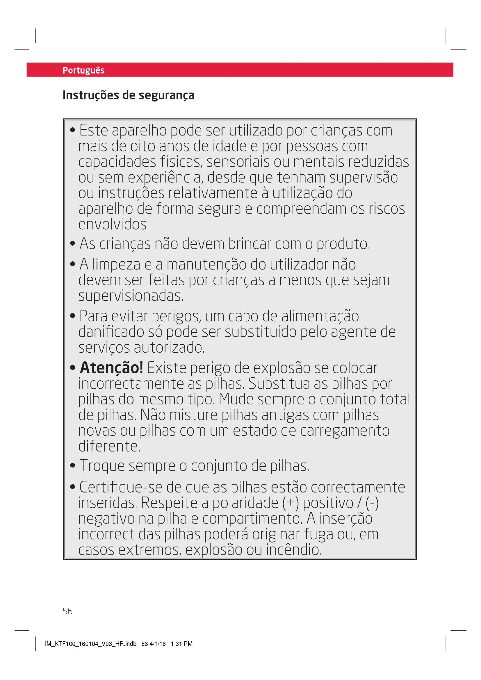 - Certifique-se de que as pilhas estão correctamente inseridas. Respeite a polaridade (+) positivo / (-) negativo na pilha e compartimento. A inserção incorrect das pilhas poderá originar fuga ou, em casos extremos, explosão ou incêndio. IM_KTF100_160104_V03_HR.indb 56 4/1/16 1:31 PMPortuguês