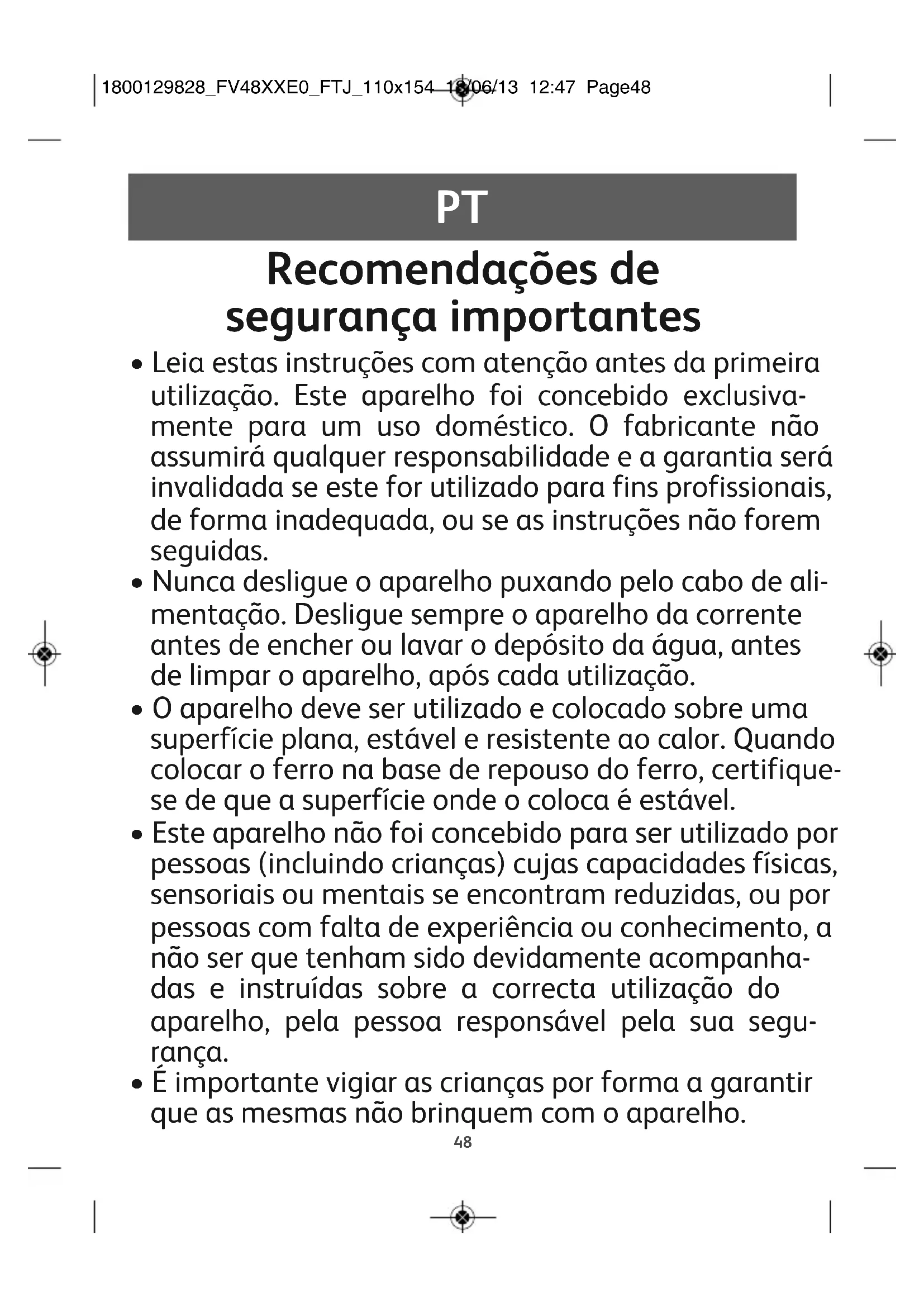 N e3o use o ferro se o cabo estiver danificado. Contacte o servi e7o de atendimento ao cliente TEFAL ou um profissional para substitui-lo.