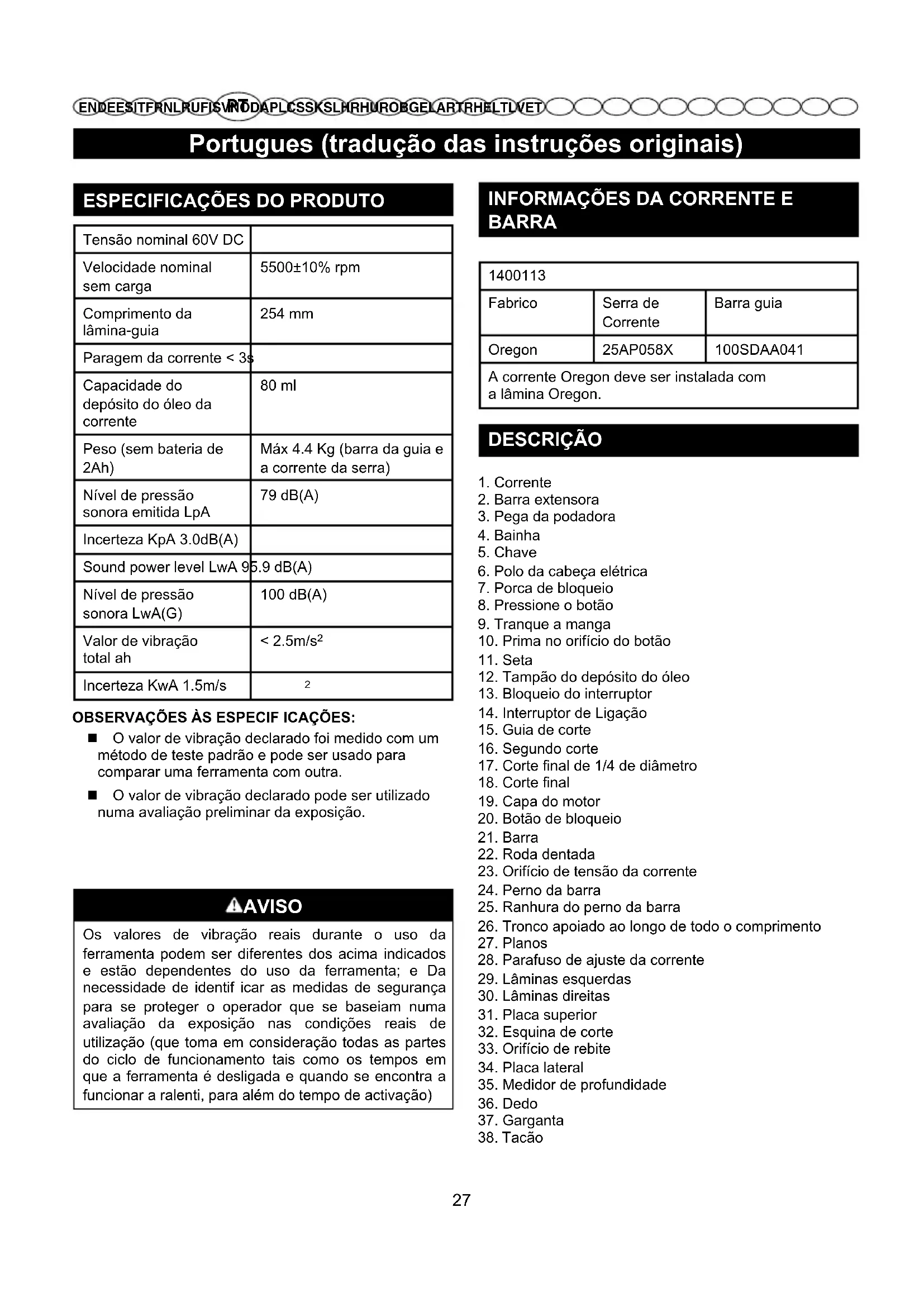 OBSERVAÇÕES ÀS ESPECIF ICAÇÕES: O valor de vibração declarado foi medido com um método de teste padrão e pode ser usado para comparar uma ferramenta com outra. O valor de vibração declarado pode ser utilizado numa avaliação preliminar da exposição. AVISO Os valores de vibração reais durante o uso da ferramenta podem ser diferentes dos acima indicados e estão dependentes do uso da ferramenta; e Da necessidade de identif icar as medidas de segurança para se proteger o operador que se baseiam numa avaliação da exposição nas condições reais de utilização (que toma em consideração todas as partes do ciclo de funcionamento tais como os tempos em que a ferramenta é desligada e quando se encontra a funcionar a ralenti, para além do tempo de activação)