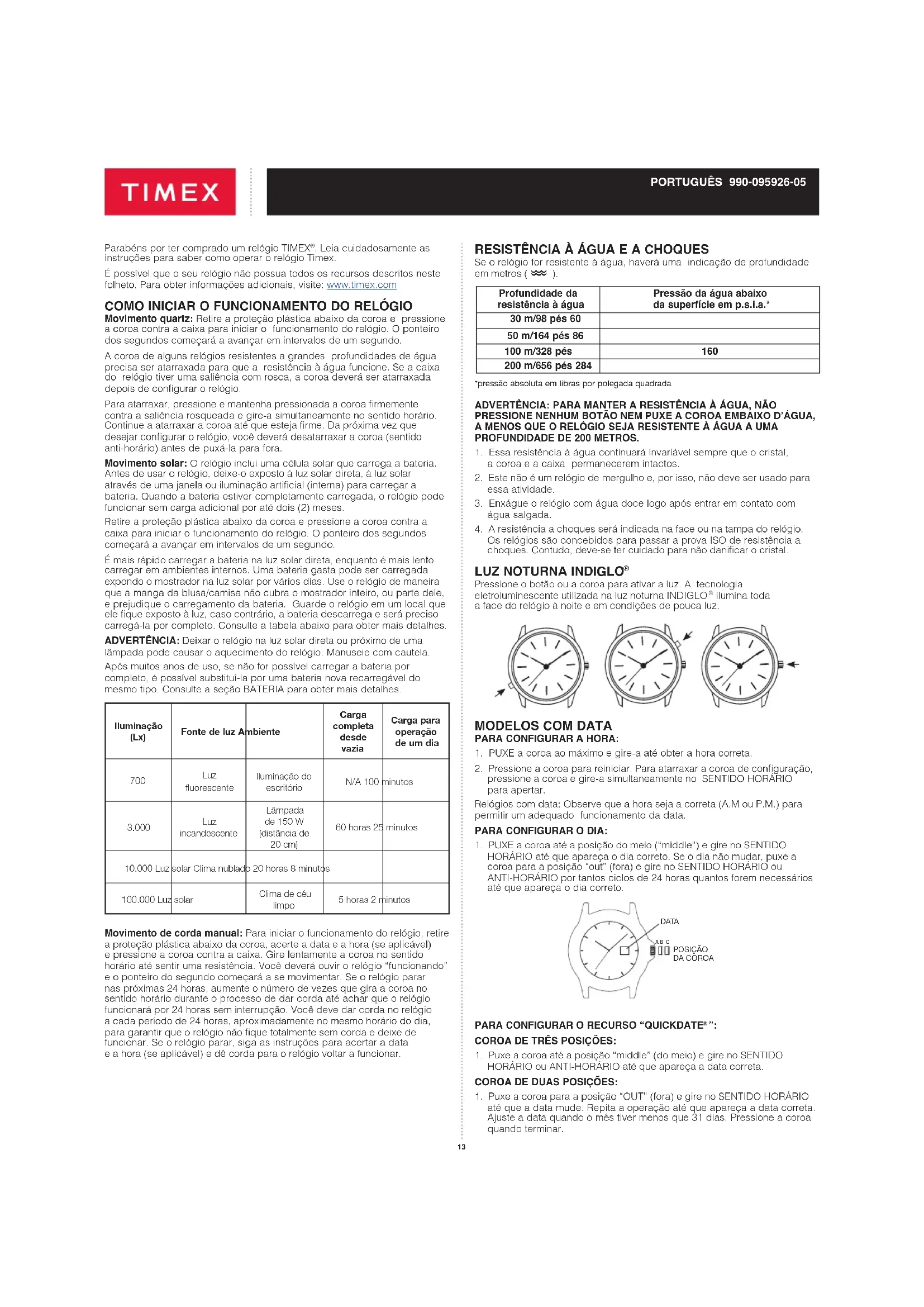. Leia cuidadosamente as instruções para saber como operar o relógio Timex. É possível que o seu relógio não possua todos os recursos descritos neste folheto. Para obter informações adicionais, visite: www.timex.com COMO INICIAR O FUNCIONAMENTO DO RELÓGIO Movimento quartz: Retire a proteção plástica abaixo da coroa e pressione a coroa contra a caixa para iniciar o funcionamento do relógio. O ponteiro dos segundos começará a avançar em intervalos de um segundo. A coroa de alguns relógios resistentes a grandes profundidades de água precisa ser atarraxada para que a resistência à água funcione. Se a caixa do relógio tiver uma saliência com rosca, a coroa deverá ser atarraxada depois de congurar o relógio. Para atarraxar, pressione e mantenha pressionada a coroa rmemente contra a saliência rosqueada e gire-a simultaneamente no sentido horário. Continue a atarraxar a coroa até que esteja rme. Da próxima vez que desejar congurar o relógio, você deverá desatarraxar a coroa (sentido anti-horário) antes de puxá-la para fora. Movimento solar: O relógio inclui uma célula solar que carrega a bateria. Antes de usar o relógio, deixe-o exposto à luz solar direta, à luz solar através de uma janela ou iluminação articial (interna) para carregar a bateria. Quando a bateria estiver completamente carregada, o relógio pode funcionar sem carga adicional por até dois (2) meses. Retire a proteção plástica abaixo da coroa e pressione a coroa contra a caixa para iniciar o funcionamento do relógio. O ponteiro dos segundos começará a avançar em intervalos de um segundo. É mais rápido carregar a bateria na luz solar direta, enquanto é mais lento carregar em ambientes internos. Uma bateria gasta pode ser carregada expondo o mostrador na luz solar por vários dias. Use o relógio de maneira que a manga da blusa/camisa não cubra o mostrador inteiro, ou parte dele, e prejudique o carregamento da bateria. Guarde o relógio em um local que ele que exposto à luz, caso contrário, a bateria descarrega e será preciso carregá-la por completo. Consulte a tabela abaixo para obter mais detalhes. ADVERTÊNCIA: Deixar o relógio na luz solar direta ou próximo de uma lâmpada pode causar o aquecimento do relógio. Manuseie com cautela. Após muitos anos de uso, se não for possível carregar a bateria por completo, é possível substituí-la por uma bateria nova recarregável do mesmo tipo. Consulte a seção BATERIA para obter mais detalhes. Iluminação (Lx) Fonte de luz Ambiente Carga completa desde vazia Carga para operação de um dia