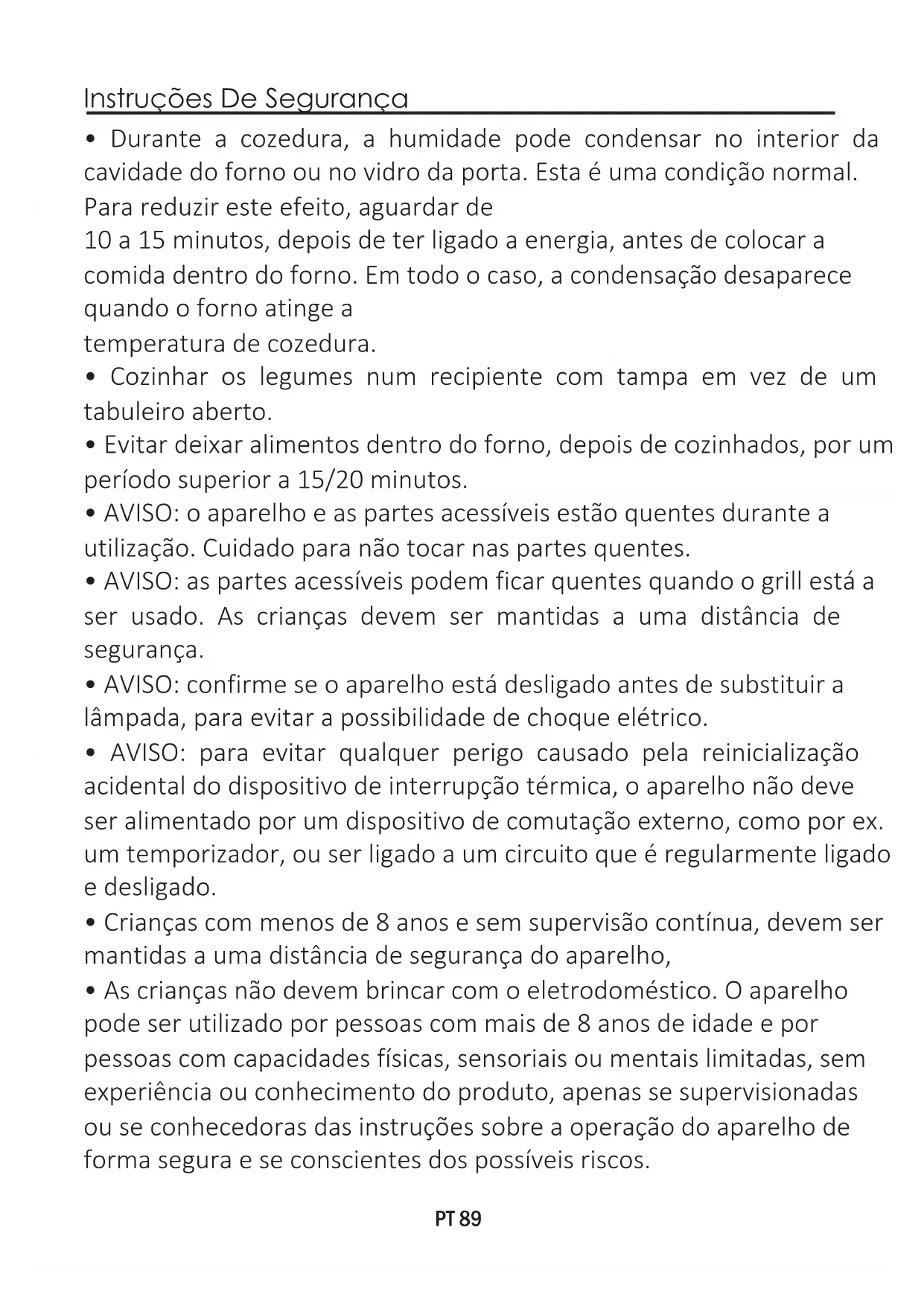 - AVISO: as partes acessíveis podem ficar quentes quando o grill está a ser usado. As crianças devem ser mantidas a uma distância de segurança. temperatura de cozedura. 10 a 15 minutos, depois de ter ligado a energia, antes de colocar a comida dentro do forno. Em todo o caso, a condensação desaparece quando o forno atinge a
