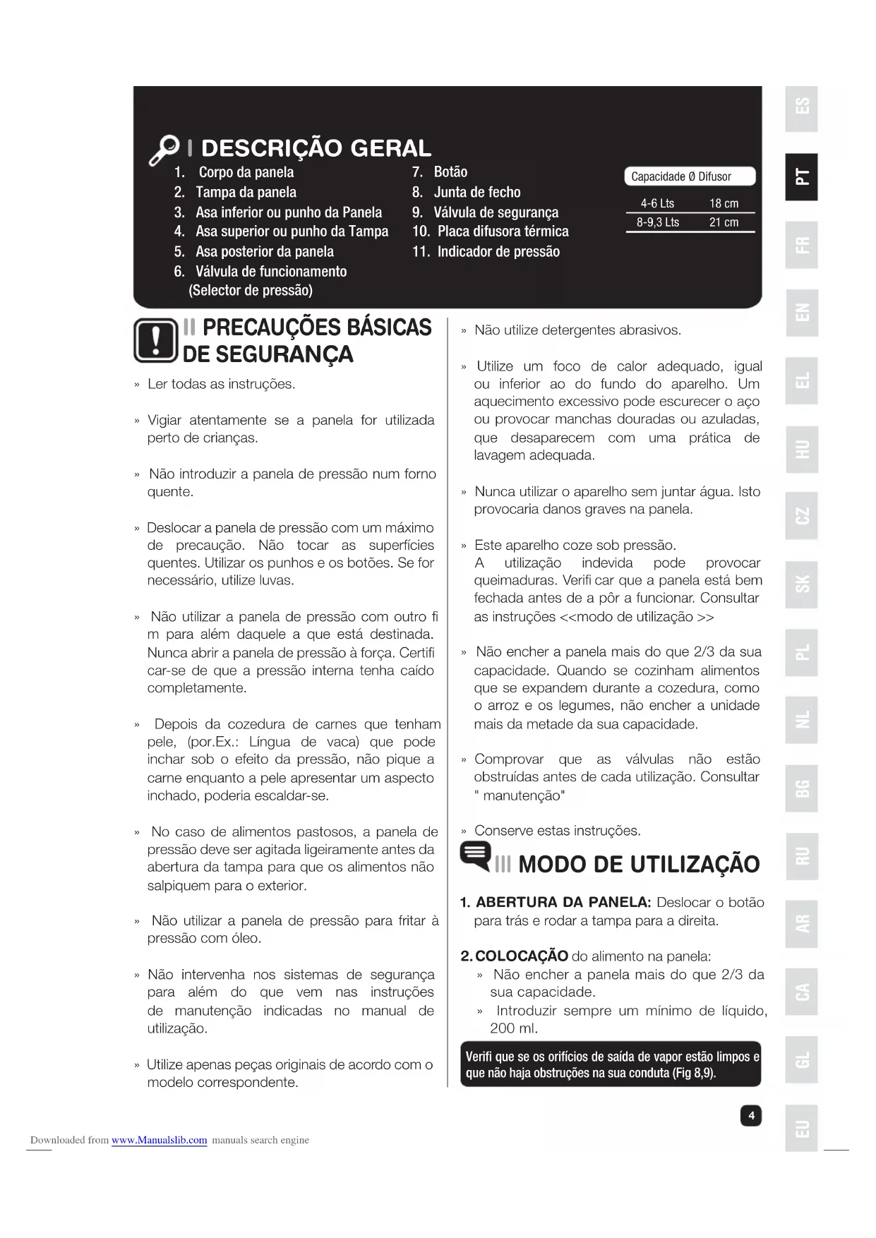 » Não encher a panela mais do que 2/3 da sua capacidade. » Introduzir sempre um mínimo de líquido, 200 ml. Verifi que se os orifícios de saída de vapor estão limpos e que não haja obstruções na sua conduta (Fig 8,9).Capacidade Ø Difusor4-6 Lts8-9,3 Lts18 cm21 cm » Ler todas as instruções. » Vigiar atentamente se a panela for utilizada perto de crianças. » Não introduzir a panela de pressão num forno quente. » Deslocar a panela de pressão com um máximo de precaução. Não tocar as superfícies quentes. Utilizar os punhos e os botões. Se for necessário, utilize luvas. » Não utilizar a panela de pressão com outro fi m para além daquele a que está destinada. Nunca abrir a panela de pressão à força. Certifi car-se de que a pressão interna tenha caído completamente. » Depois da cozedura de carnes que tenham pele, (por.Ex.: Língua de vaca) que pode inchar sob o efeito da pressão, não pique a carne enquanto a pele apresentar um aspecto inchado, poderia escaldar-se. » No caso de alimentos pastosos, a panela de pressão deve ser agitada ligeiramente antes da abertura da tampa para que os alimentos não salpiquem para o exterior. » Não utilizar a panela de pressão para fritar à pressão com óleo. » Não intervenha nos sistemas de segurança para além do que vem nas instruções de manutenção indicadas no manual de utilização. » Utilize apenas peças originais de acordo com o modelo correspondente.