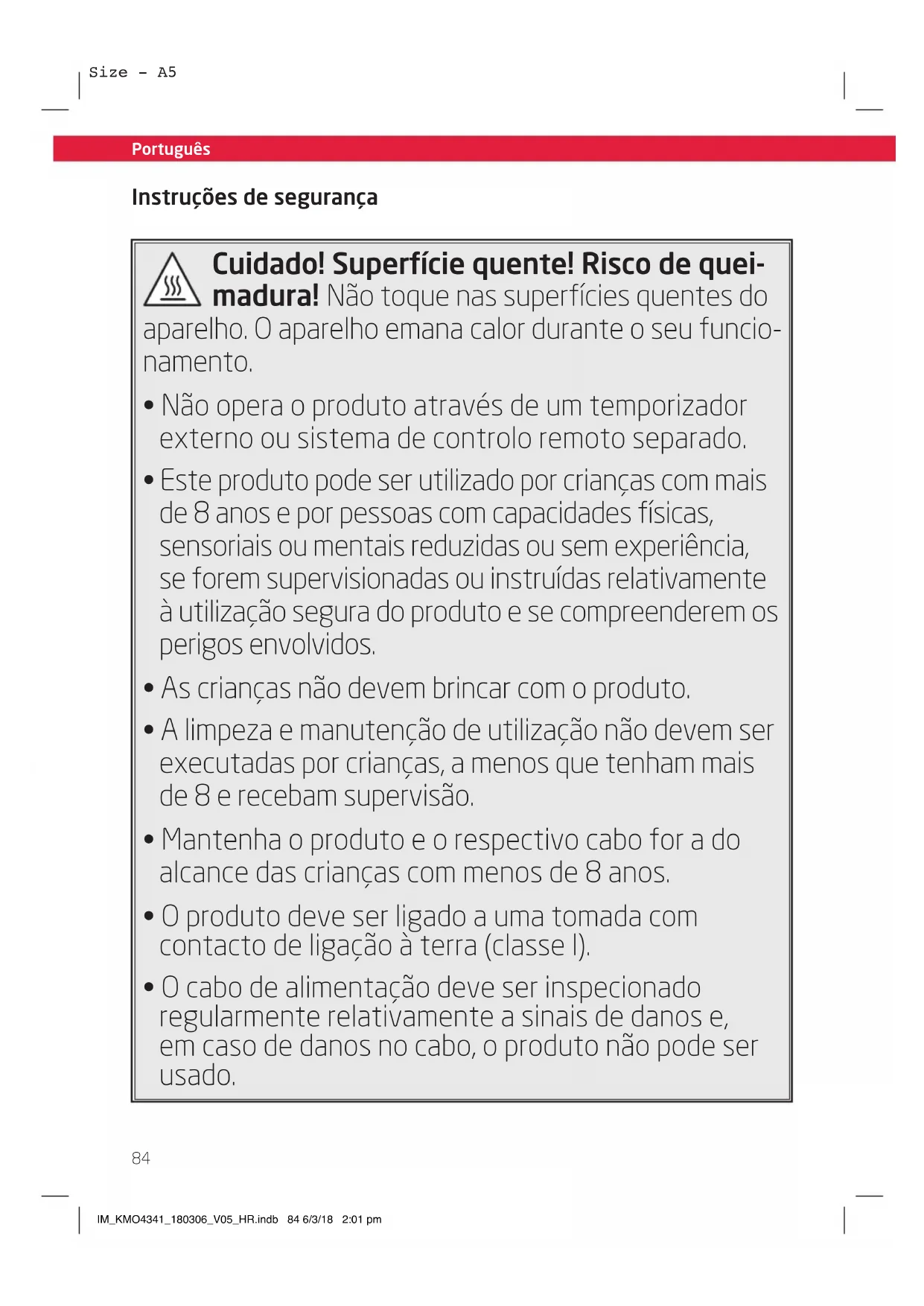 - O cabo de alimentação deve ser inspecionado regularmente relativamente a sinais de danos e, em caso de danos no cabo, o produto não pode ser usado. IM_KMO4341_180306_V05_HR.indb 84 6/3/18 2:01 pmPortuguês