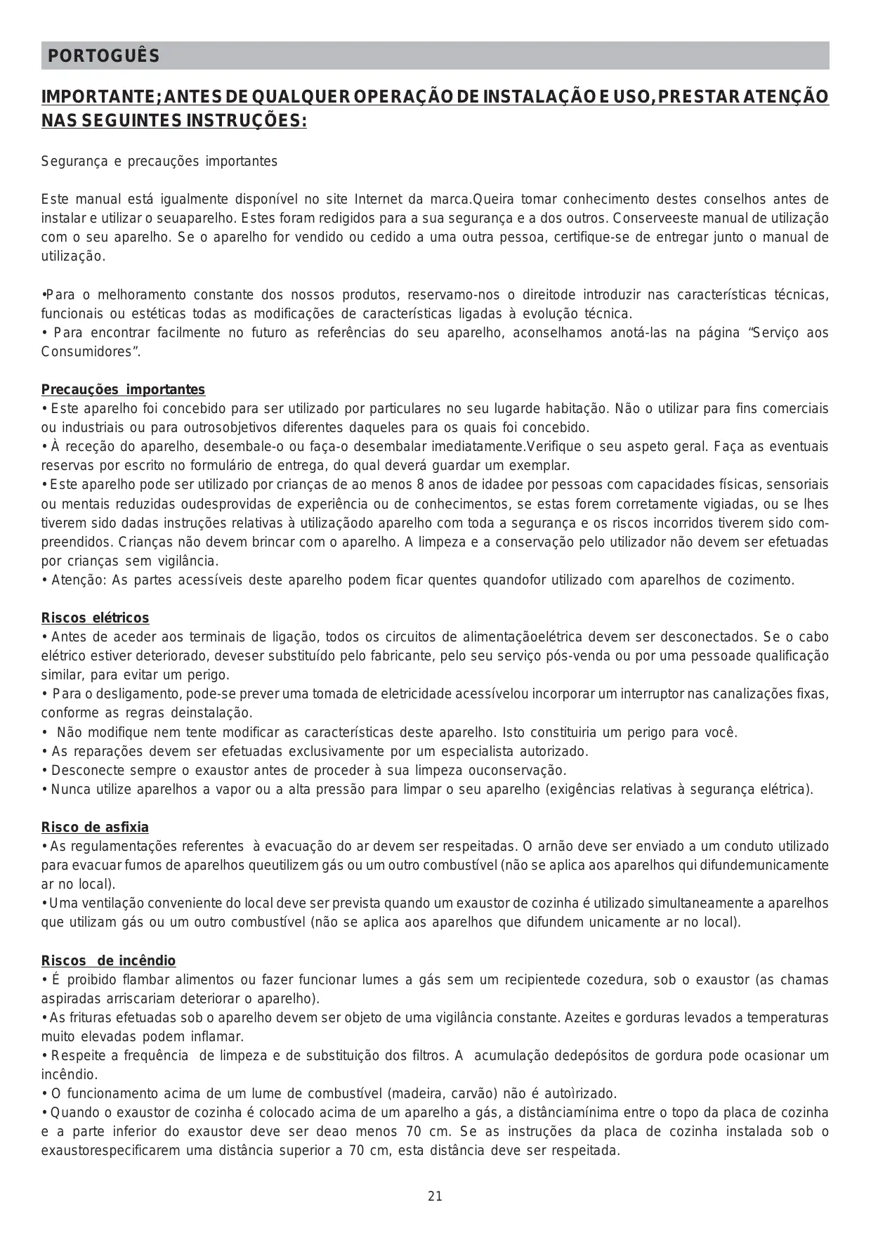 ANTES DE QUALQUER OPERACAO, DESLIGAR A COIFA DA TENSAO (TOMADA DE FORCA ou INTERRUPTOR). Una cuidadao manutencao garantue um bom functiomento e um bom rendimento no tempo.