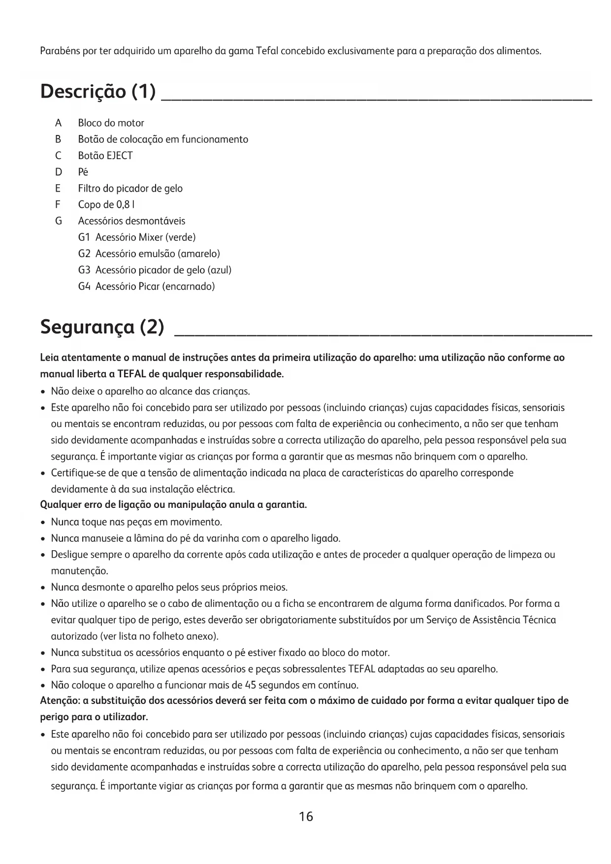 Filtro do picador de gelo Copo de 0,8 l Acessórios desmontáveis G1 Acessório Mixer (verde) G2 Acessório emulsão (amarelo) G3 Acessório picador de gelo (azul) G4 Acessório Picar (encarnado) Segurança (2) ________________________________________________ Leia atentamente o manual de instruções antes da primeira utilização do aparelho: uma utilização não conforme ao manual liberta a TEFAL de qualquer responsabilidade. Não deixe o aparelho ao alcance das crianças. Este aparelho não foi concebido para ser utilizado por pessoas (incluindo crianças) cujas capacidades físicas, sensoriais ou mentais se encontram reduzidas, ou por pessoas com falta de experiência ou conhecimento, a não ser que tenham sido devidamente acompanhadas e instruídas sobre a correcta utilização do aparelho, pela pessoa responsável pela sua segurança. É importante vigiar as crianças por forma a garantir que as mesmas não brinquem com o aparelho. Certifique-se de que a tensão de alimentação indicada na placa de características do aparelho corresponde devidamente à da sua instalação eléctrica. Qualquer erro de ligação ou manipulação anula a garantia. Nunca toque nas peças em movimento. Nunca manuseie a lâmina do pé da varinha com o aparelho ligado. Desligue sempre o aparelho da corrente após cada utilização e antes de proceder a qualquer operação de limpeza ou manutenção. Nunca desmonte o aparelho pelos seus próprios meios. Não utilize o aparelho se o cabo de alimentação ou a ficha se encontrarem de alguma forma danificados. Por forma a evitar qualquer tipo de perigo, estes deverão ser obrigatoriamente substituídos por um Serviço de Assistência Técnica autorizado (ver lista no folheto anexo). Nunca substitua os acessórios enquanto o pé estiver fixado ao bloco do motor. Para sua segurança, utilize apenas acessórios e peças sobressalentes TEFAL adaptadas ao seu aparelho. Não coloque o aparelho a funcionar mais de 45 segundos em contínuo. Atenção: a substituição dos acessórios deverá ser feita com o máximo de cuidado por forma a evitar qualquer tipo de perigo para o utilizador. Este aparelho não foi concebido para ser utilizado por pessoas (incluindo crianças) cujas capacidades físicas, sensoriais ou mentais se encontram reduzidas, ou por pessoas com falta de experiência ou conhecimento, a não ser que tenham sido devidamente acompanhadas e instruídas sobre a correcta utilização do aparelho, pela pessoa responsável pela sua segurança. É importante vigiar as crianças por forma a garantir que as mesmas não brinquem com o aparelho.
