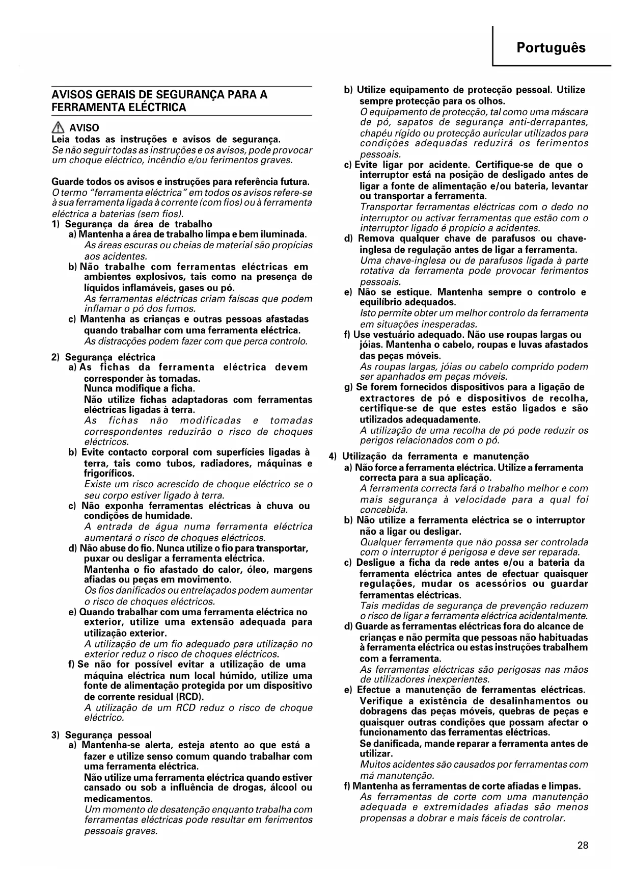 AVISO Leia todas as instruções e avisos de segurança. Se não seguir todas as instruções e os avisos, pode provocar um choque eléctrico, incêndio e/ou ferimentos graves. Guarde todos os avisos e instruções para referência futura. O termo “ferramenta eléctrica” em todos os avisos refere-se à sua ferramenta ligada à corrente (com fios) ou à ferramenta eléctrica a baterias (sem fios).