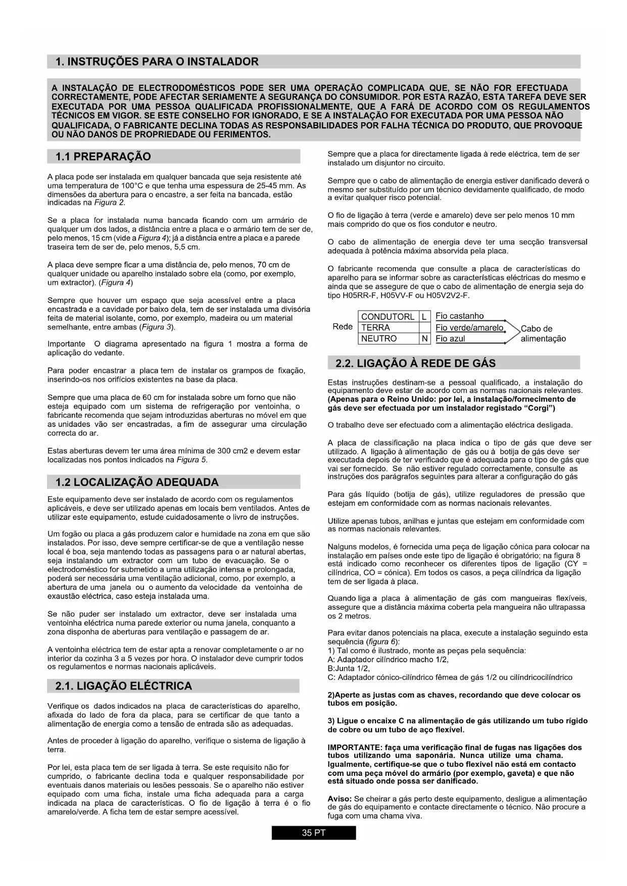 2.1. Ligação Eléctrica 2.2. Ligação À Rede De Gás 2.3. Adaptação Da Placa A Diferentes Tipos De Gás 2.4. Regulação Da Altura Mínima Da Chama