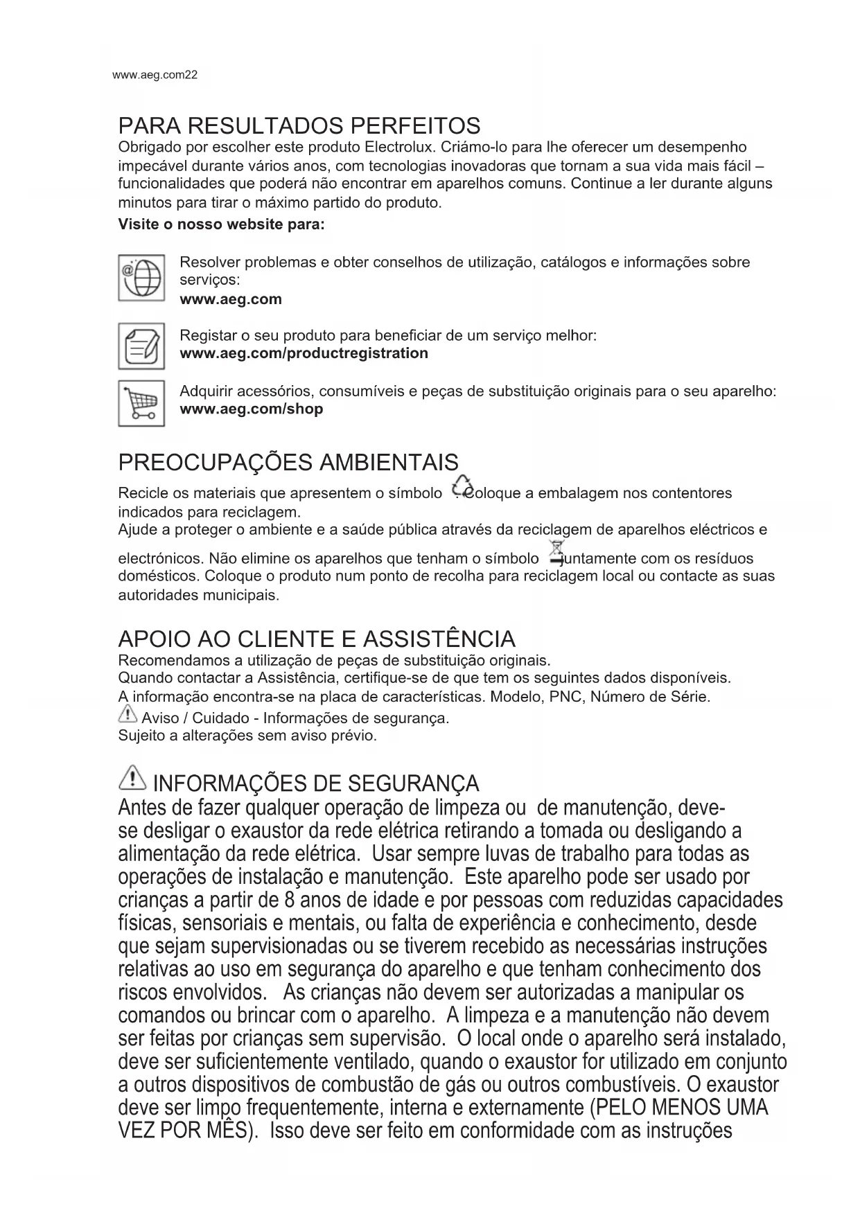 Obrigado por escolher este produto Electrolux. Criámo-lo para lhe oferecer um desempenho impecável durante vários anos, com tecnologias inovadoras que tornam a sua vida mais fácil – funcionalidades que poderá não encontrar em aparelhos comuns. Continue a ler durante alguns minutos para tirar o máximo partido do produto. Visite o nosso website para: Resolver problemas e obter conselhos de utilização, catálogos e informações sobre serviços: www.aeg.com Registar o seu produto para beneciar de um serviço melhor: www.aeg.com/productregistration Adquirir acessórios, consumíveis e peças de substituição originais para o seu aparelho: www.aeg.com/shop