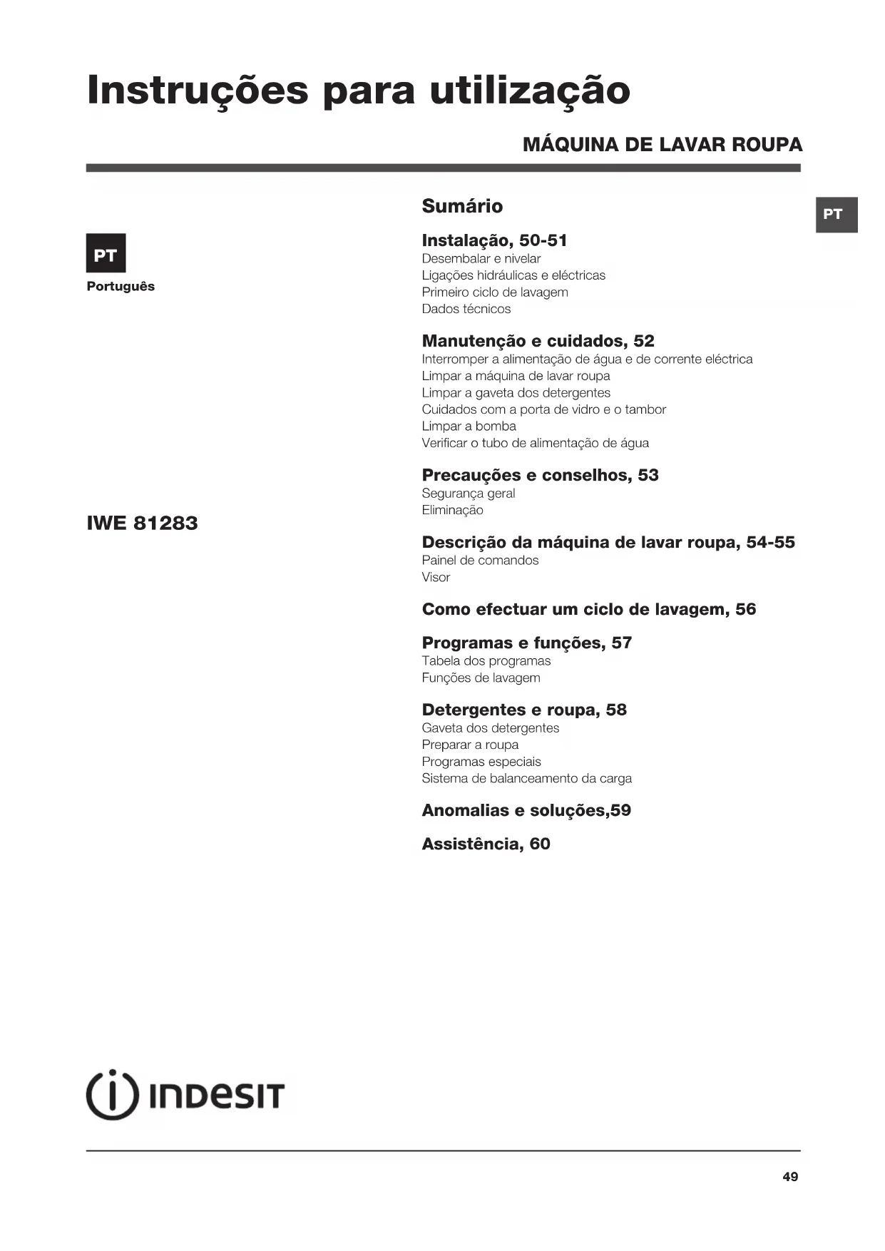 Português Sumário Instalação, 50-51 Desembalar e nivelar Ligações hidráulicas e eléctricas Primeiro ciclo de lavagem Dados técnicos Manutenção e cuidados, 52 Interromper a alimentação de água e de corrente eléctrica Limpar a máquina de lavar roupa Limpar a gaveta dos detergentes Cuidados com a porta de vidro e o tambor Limpar a bomba Verificar o tubo de alimentação de água Precauções e conselhos, 53 Segurança geral Eliminação Descrição da máquina de lavar roupa, 54-55 Painel de comandos Visor Como efectuar um ciclo de lavagem, 56 Programas e funções, 57 Tabela dos programas Funções de lavagem Detergentes e roupa, 58 Gaveta dos detergentes Preparar a roupa Programas especiais Sistema de balanceamento da carga Anomalias e soluções,59 Assistência, 60
