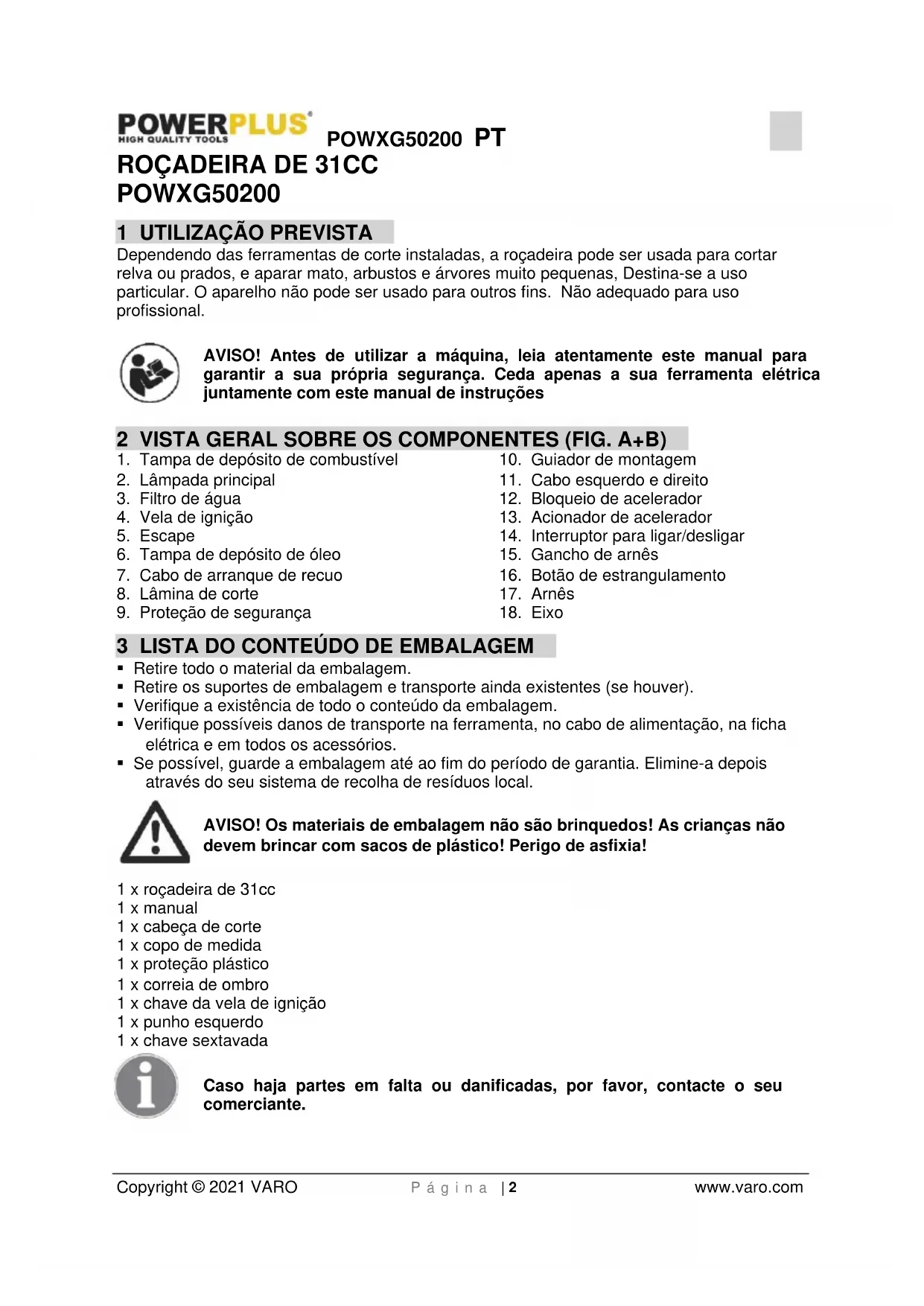 - Não empilhe os artigos sobre o roçador.POWXG50200 PT Copyright © 2021 VARO P á g i n a | 14 www.varo.com