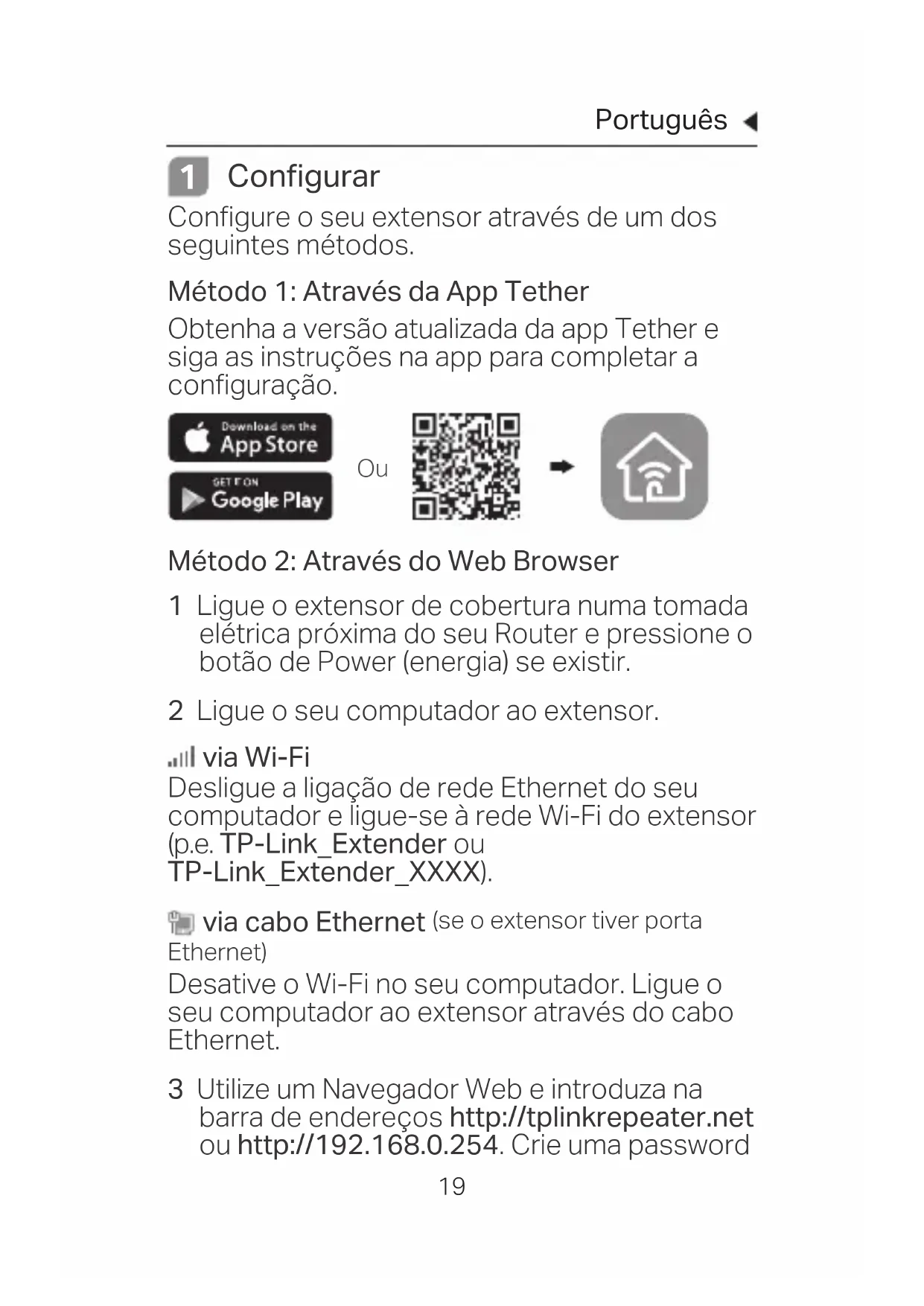 Configurar Configure o seu extensor através de um dos seguintes métodos. Método 1: Através da App Tether Obtenha a versão atualizada da app Tether e siga as instruções na app para completar a configuração. Método 2: Através do Web Browser 1 Ligue o extensor de cobertura numa tomada elétrica próxima do seu Router e pressione o botão de Power (energia) se existir. 2 Ligue o seu computador ao extensor. via Wi-Fi Desligue a ligação de rede Ethernet do seu computador e ligue-se à rede Wi-Fi do extensor (p.e. TP-Link_Extender ou TP-Link_Extender_XXXX). via cabo Ethernet (se o extensor tiver porta Ethernet) Desative o Wi-Fi no seu computador. Ligue o seu computador ao extensor através do cabo Ethernet. 3 Utilize um Navegador Web e introduza na barra de endereços http://tplinkrepeater.net ou http://192.168.0.254. Crie uma password OuPortuguês