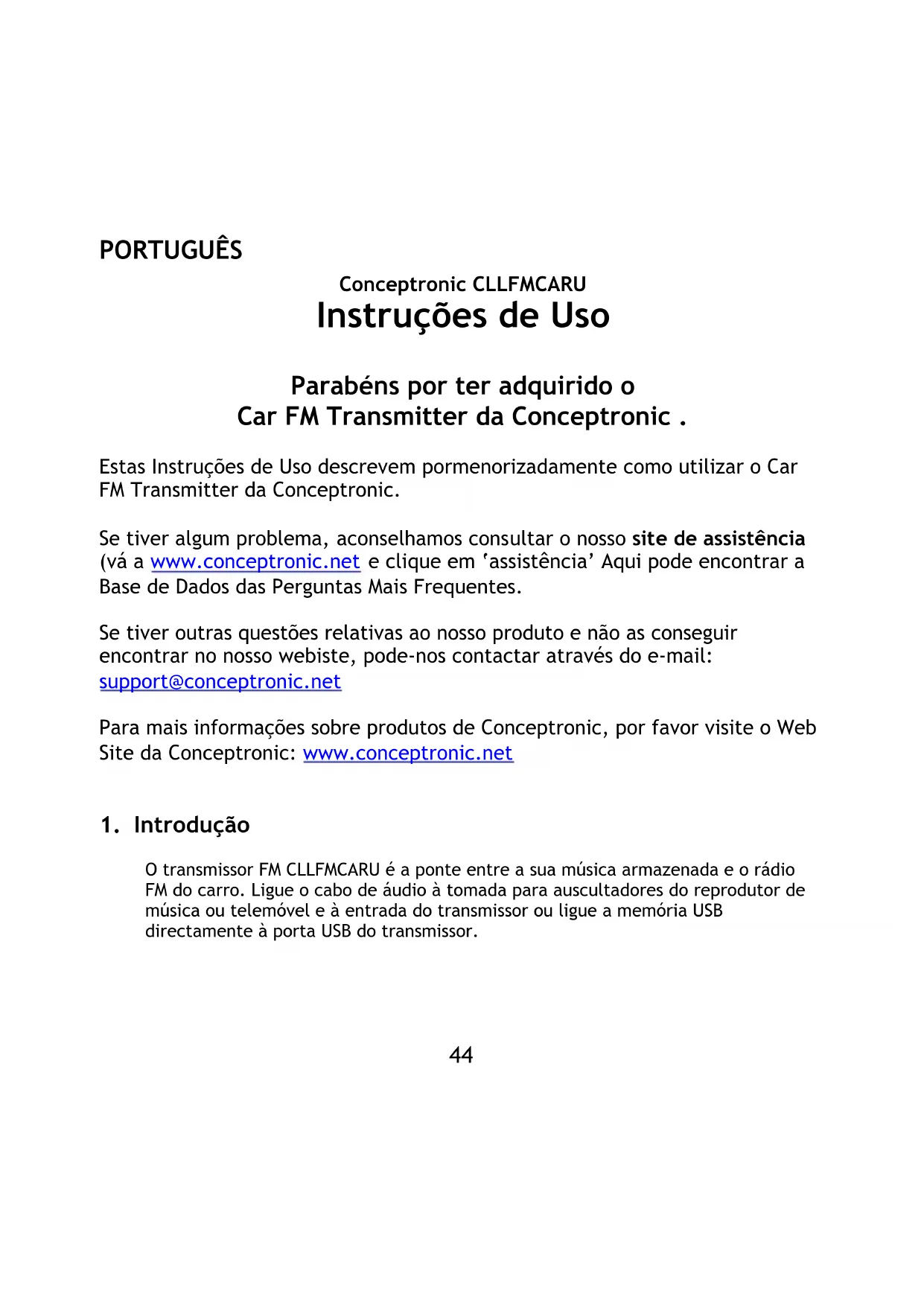 Conceptronic CLLFMCARU Instruções de Uso Parabéns por ter adquirido o Car FM Transmitter da Conceptronic . Estas Instruções de Uso descrevem pormenorizadamente como utilizar o Car FM Transmitter da Conceptronic. Se tiver algum problema, aconselhamos consultar o nosso site de assistência (vá a www.conceptronic.net e clique em ‘assistência’ Aqui pode encontrar a Base de Dados das Perguntas Mais Frequentes. Se tiver outras questões relativas ao nosso produto e não as conseguir encontrar no nosso webiste, pode-nos contactar através do e-mail: support@conceptronic.net