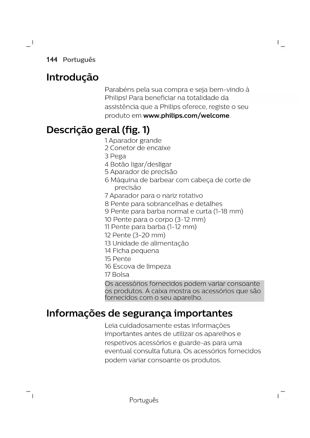 NorskPortuguês Introdução Parabéns pela sua compra e seja bem-vindo à Philips! Para beneficiar na totalidade da assistência que a Philips oferece, registe o seu produto em www.philips.com/welcome. Descrição geral (fig. 1) 1 Aparador grande 2 Conetor de encaixe 3 Pega 4 Botão ligar/desligar 5 Aparador de precisão 6 Máquina de barbear com cabeça de corte de precisão 7 Aparador para o nariz rotativo 8 Pente para sobrancelhas e detalhes 9 Pente para barba normal e curta (1-18mm) 10 Pente para o corpo (3-12mm) 11 Pente para barba (1-12mm) 12 Pente (3-20mm) 13 Unidade de alimentação 14 Ficha pequena 15 Pente 16 Escova de limpeza 17 Bolsa Os acessórios fornecidos podem variar consoante os produtos. A caixa mostra os acessórios que são fornecidos com o seu aparelho. Informações de segurança importantes Leia cuidadosamente estas informações importantes antes de utilizar os aparelhos e respetivos acessórios e guarde-as para uma eventual consulta futura. Os acessórios fornecidos podem variar consoante os produtos.