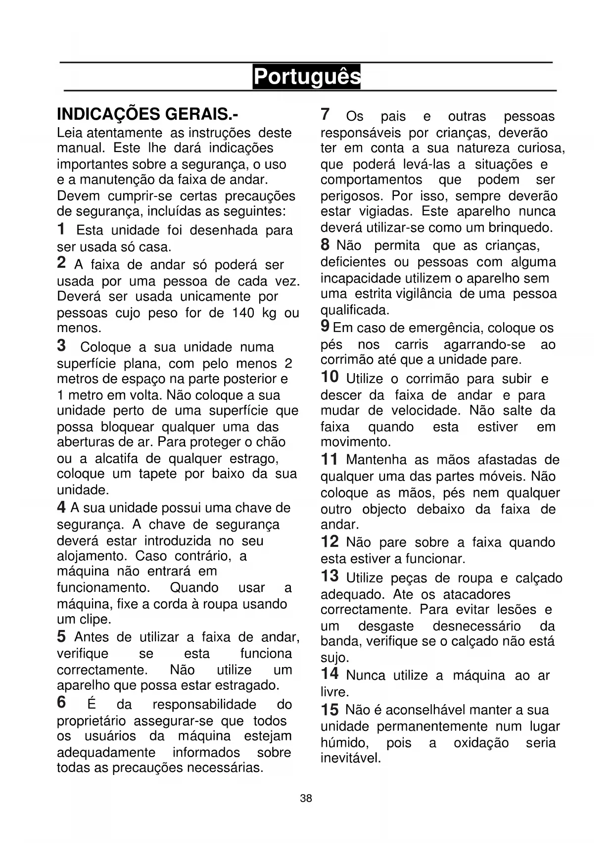 Leia atentamente as instruções deste manual. Este lhe dará indicações importantes sobre a segurança, o uso e a manutenção da faixa de andar. Devem cumprir-se certas precauções de segurança, incluídas as seguintes: