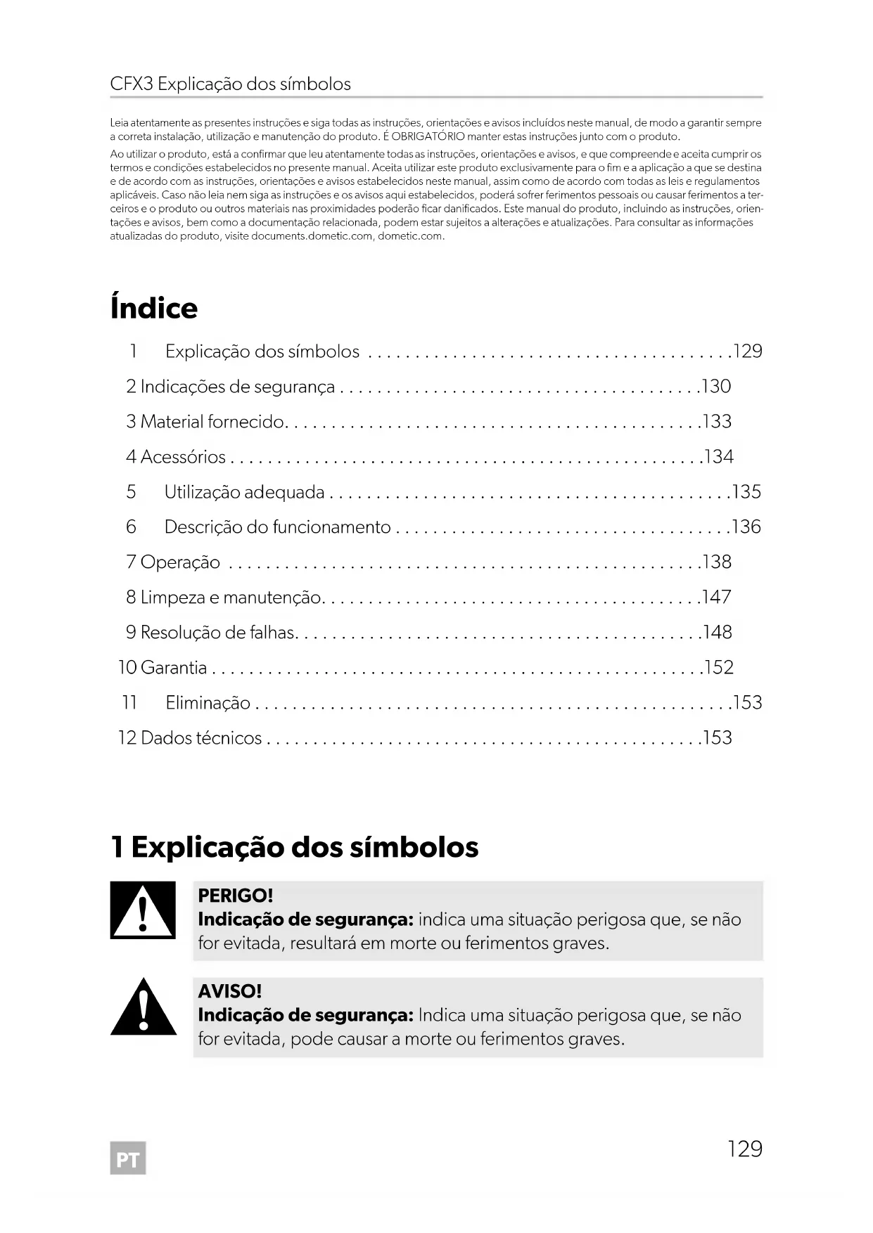 - Leia atentamente as presentes instruções e siga todas as instruções, orientações e avisos incluídos neste manual, de modo a garantir sempre a correta instalação, utilização e manutenção do produto. É OBRIGATÓRIO manter estas instruções junto com o produto. Ao utilizar o produto, está a confirmar que leu atentamente todas as instruções, orientações e avisos, e que compreende e aceita cumprir os termos e condições estabelecidos no presente manual. Aceita utilizar este produto exclusivamente para o fim e a aplicação a que se destina e de acordo com as instruções, orientações e avisos estabelecidos neste manual, assim como de acordo com todas as leis e regulamentos aplicáveis. Caso não leia nem siga as instruções e os avisos aqui estabelecidos, poderá sofrer ferimentos pessoais ou causar ferimentos a ter- ceiros e o produto ou outros materiais nas proximidades poderão ficar danificados. Este manual do produto, incluindo as instruções, orien- tações e avisos, bem como a documentação relacionada, podem estar sujeitos a alterações e atualizações. Para consultar as informações atualizadas do produto, visite documents.dometic.com, dometic.com. Índice 1 Explicação dos símbolos p. 129