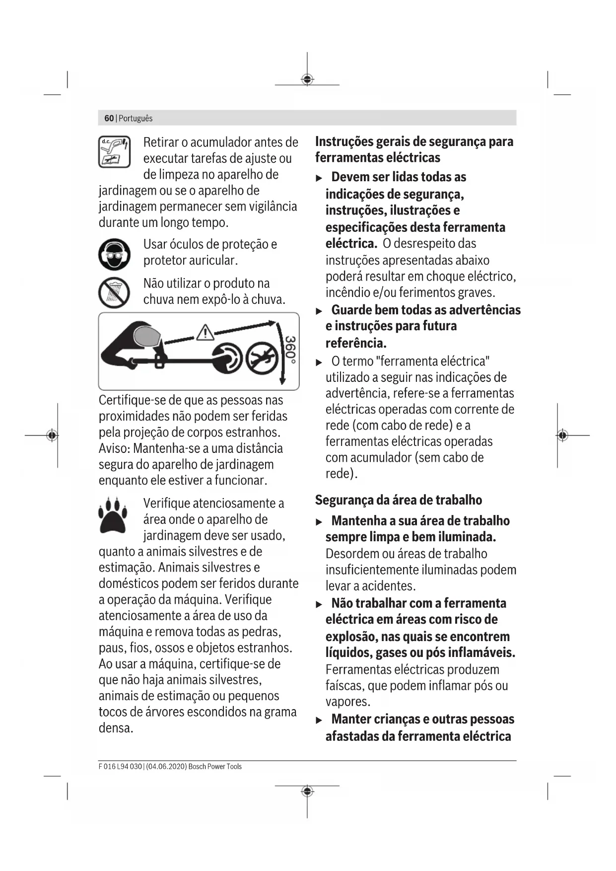 a.c. Não aplicável. Bosch Power Tools F 016 L94 030 | (04.06.2020)60 | Português d.c. Retirar o acumulador antes de executar tarefas de ajuste ou de limpeza no aparelho de jardinagem ou se o aparelho de jardinagem permanecer sem vigilância durante um longo tempo. Usar óculos de proteção e protetor auricular. Não utilizar o produto na chuva nem expô-lo à chuva. Certifique-se de que as pessoas nas proximidades não podem ser feridas pela projeção de corpos estranhos. Aviso: Mantenha-se a uma distância segura do aparelho de jardinagem enquanto ele estiver a funcionar. Verifique atenciosamente a área onde o aparelho de jardinagem deve ser usado, quanto a animais silvestres e de estimação. Animais silvestres e domésticos podem ser feridos durante a operação da máquina. Verifique atenciosamente a área de uso da máquina e remova todas as pedras, paus, fios, ossos e objetos estranhos. Ao usar a máquina, certifique-se de que não haja animais silvestres, animais de estimação ou pequenos tocos de árvores escondidos na grama densa. Instruções gerais de segurança para ferramentas eléctricas u Devem ser lidas todas as indicações de segurança, instruções, ilustrações e especificações desta ferramenta eléctrica. O desrespeito das instruções apresentadas abaixo poderá resultar em choque eléctrico, incêndio e/ou ferimentos graves. u Guarde bem todas as advertências e instruções para futura referência. u O termo "ferramenta eléctrica" utilizado a seguir nas indicações de advertência, refere‑se a ferramentas eléctricas operadas com corrente de rede (com cabo de rede) e a ferramentas eléctricas operadas com acumulador (sem cabo de rede). Segurança da área de trabalho u Mantenha a sua área de trabalho sempre limpa e bem iluminada. Desordem ou áreas de trabalho insuficientemente iluminadas podem levar a acidentes. u Não trabalhar com a ferramenta eléctrica em áreas com risco de explosão, nas quais se encontrem líquidos, gases ou pós inflamáveis. Ferramentas eléctricas produzem faíscas, que podem inflamar pós ou vapores. u Manter crianças e outras pessoas afastadas da ferramenta eléctrica F 016 L94 030 | (04.06.2020) Bosch Power ToolsPortuguês | 61 durante a utilização. No caso de distracção é possível que perca o controlo sobre o aparelho. Segurança eléctrica u A ficha de conexão da ferramenta eléctrica deve caber na tomada. A ficha não deve ser modificada de maneira alguma. Não utilizar uma ficha de adaptação junto com ferramentas eléctricas protegidas por ligação à terra. Fichas não modificadas e tomadas apropriadas reduzem o risco de um choque eléctrico. u Evitar que o corpo possa entrar em contacto com superfícies ligadas à terra, como tubos, aquecimentos, fogões e frigoríficos. Há um risco elevado devido a choque eléctrico, se o corpo estiver ligado à terra. u Manter o aparelho afastado de chuva ou humidade. A infiltração de água numa ferramenta eléctrica aumenta o risco de choque eléctrico. u Não deverá utilizar o cabo para outras finalidades. Nunca utilizar o cabo para transportar a ferramenta eléctrica, para pendurá‑la, nem para puxar a ficha da tomada. Manter o cabo afastado do calor, do óleo, de arestas afiadas ou de peças em movimento. Cabos danificados ou emaranhados aumentam o risco de um choque eléctrico. u Se trabalhar com uma ferramenta eléctrica ao ar livre, só deverá utilizar cabos de extensão apropriados para áreas exteriores. A utilização de um cabo de extensão apropriado para áreas exteriores reduz o risco de um choque eléctrico. u Se não for possível evitar o funcionamento da ferramenta eléctrica em áreas húmidas, deverá ser utilizado um disjuntor de corrente de avaria. A utilização de um disjuntor de corrente de avaria reduz o risco de um choque eléctrico. Segurança de pessoas u Esteja atento, observe o que está a fazer e tenha prudência ao trabalhar com a ferramenta eléctrica. Não utilizar uma ferramenta eléctrica quando estiver fatigado ou sob a influência de drogas, álcool ou medicamentos. Um momento de descuido ao utilizar a ferramenta eléctrica, pode levar a lesões graves. u Utilizar equipamento de protecção individual. Utilizar sempre óculos de protecção. A utilização de equipamento de protecção pessoal, como máscara de protecção contra pó, sapatos de segurança antiderrapantes, capacete de segurança ou protecção auricular, de acordo com o tipo e aplicação da Bosch Power Tools F 016 L94 030 | (04.06.2020)62 | Português ferramenta eléctrica, reduz o risco de lesões. u Evitar uma colocação em funcionamento involuntária. Assegure‑se de que a ferramenta eléctrica esteja desligada, antes de conectá‑la à alimentação de rede e/ou ao acumulador, antes de levantá‑la ou de transportá‑la. Se tiver o dedo no interruptor ao transportar a ferramenta eléctrica ou se o aparelho for conectado à alimentação de rede enquanto estiver ligado, poderão ocorrer acidentes. u Remover ferramentas de ajuste ou chaves de boca antes de ligar a ferramenta eléctrica. Uma ferramenta ou chave que se encontre numa parte do aparelho em movimento pode levar a lesões. u Evite uma posição anormal. Mantenha uma posição firme e mantenha sempre o equilíbrio. Desta forma é mais fácil controlar a ferramenta eléctrica em situações inesperadas. u Usar roupa apropriada. Não usar roupa larga nem jóias. Mantenha os cabelos e roupas afastados de peças em movimento. Roupas frouxas, cabelos longos ou jóias podem ser agarrados por peças em movimento. u Se for possível montar dispositivos de aspiração ou de recolha, assegure‑se de que estejam conectados e utilizados correctamente. A utilização de uma aspiração de pó pode reduzir o perigo devido ao pó. u Não deixe que a familiaridade resultante de uma utilização frequente de ferramentas permita que você se torne complacente e ignore os princípios de segurança da ferr