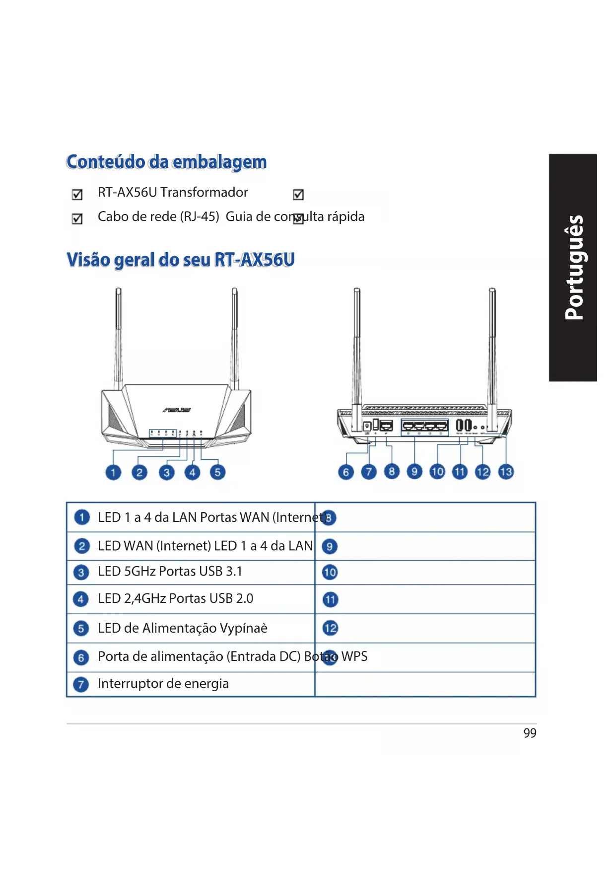- Dunnerbruksanvisningenpånettetpåhttps://www.asus.com/support99 Português Visão geral do seu RT-AX56U Conteúdo da embalagem RT-AX56U Transformador Cabo de rede (RJ-45) Guia de consulta rápida LED 1 a 4 da LAN Portas WAN (Internet) LED WAN (Internet) LED 1 a 4 da LAN LED 5GHz Portas USB 3.1 LED 2,4GHz Portas USB 2.0 LED de Alimentação Vypínaè Porta de alimentação (Entrada DC) Botão WPS Interruptor de energia100 Português Colocação do router Para garantir a melhor qualidade de transmissão entre o router sem os e os dispositivos de rede a ele ligados: