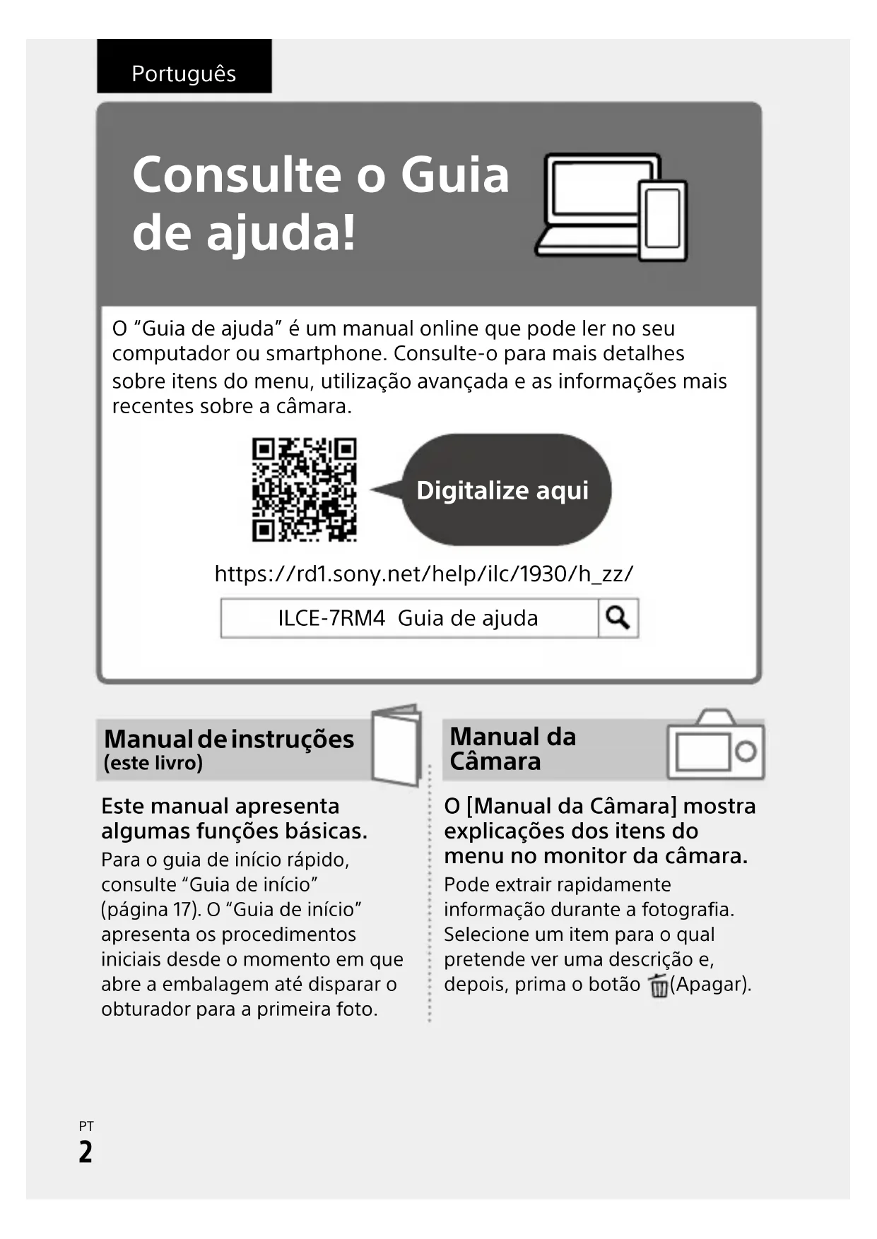C:\01_Compose\5007325412\5007325412ILCE7RM4CEC\06PT-ILCE7RM4CEC\010BEF.indd DTP data saved: 2019/06/24 12:19 PDF file created: 2019/06/24 12:38 Português Consulte o Guia de ajuda! O “Guia de ajuda” é um manual online que pode ler no seu computador ou smartphone. Consulte-o para mais detalhes sobre itens do menu, utilização avançada e as informações mais recentes sobre a câmara. Digitalize aqui https://rd1.sony.net/help/ilc/1930/h_zz/ Manual de instruções (este livro) Manual da Câmara Este manual apresenta algumas funções básicas. Para o guia de início rápido, consulte “Guia de início” (página17). O “Guia de início” apresenta os procedimentos iniciais desde o momento em que abre a embalagem até disparar o obturador para a primeira foto. O [Manual da Câmara] mostra explicações dos itens do menu no monitor da câmara. Pode extrair rapidamente informação durante a fotografia.Selecione um item para o qual pretende ver uma descrição e, depois, prima o botão (Apagar). ILCE-7RM4 Guia de ajudaILCE-7RM4 5-007-325-41(2)