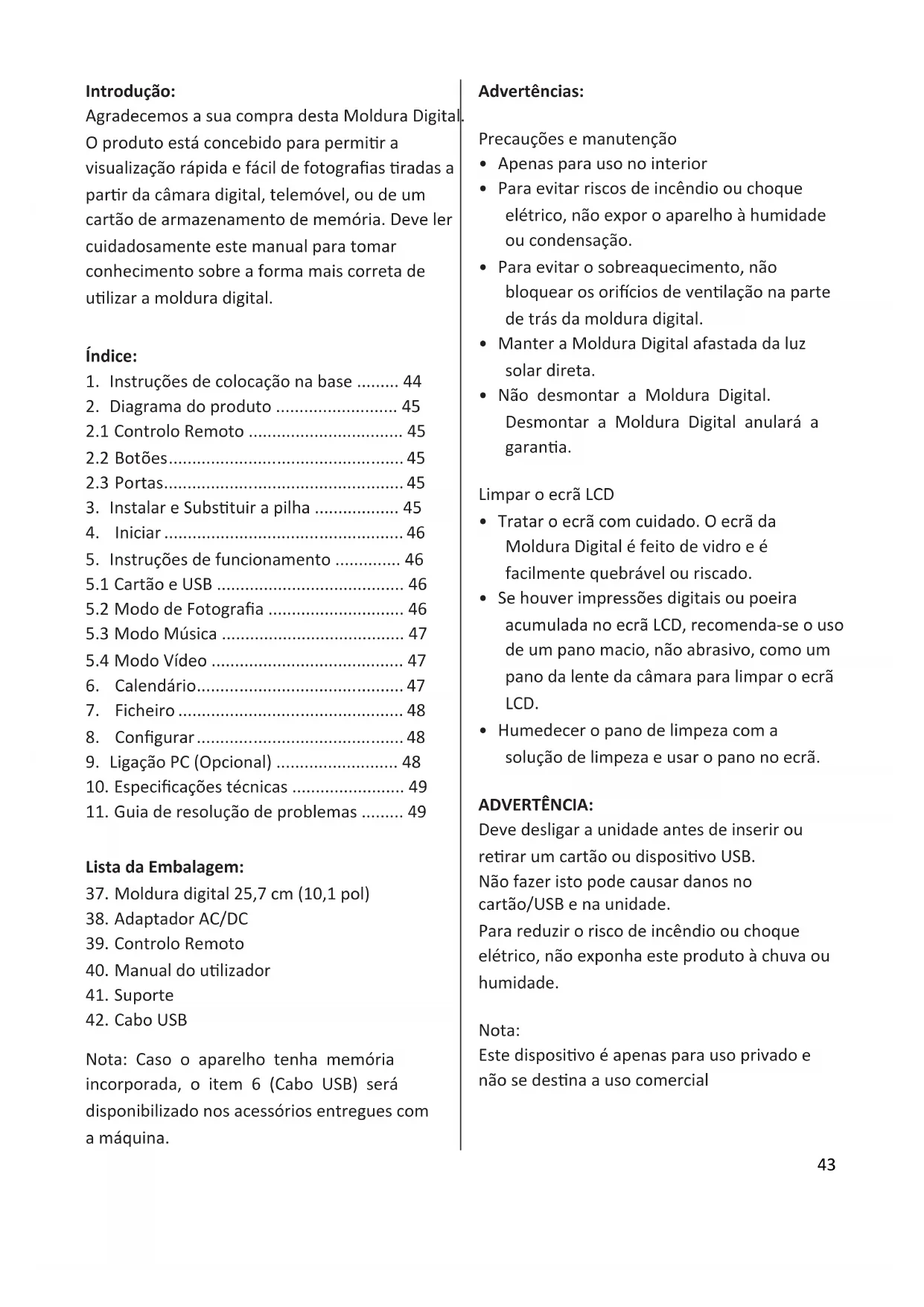 - Humedecer o pano de limpeza com a solução de limpeza e usar o pano no ecrã. ADVERTÊNCIA: Deve desligar a unidade antes de inserir ou retirar um cartão ou dispositivo USB. Não fazer isto pode causar danos no cartão/USB e na unidade. Para reduzir o risco de incêndio ou choque elétrico, não exponha este produto à chuva ou humidade. Nota: Este dispositivo é apenas para uso privado e não se destina a uso comercial44 Caraterísticas: