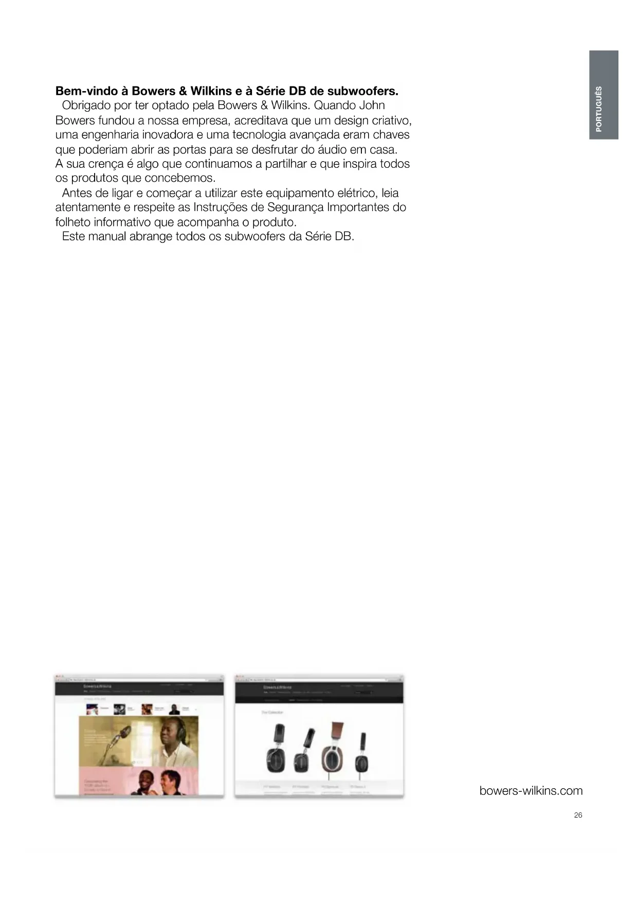 En el caso de que necesite ayuda o consejo adicional para subwoofers de la Serie DB, le rogamos que visite nuestro sitio de soporte aquí. Página principal Página de conguración de entradas26 PORTUGUÊS bowers-wilkins.com Bem-vindo à Bowers & Wilkins e à Série DB de subwoofers. Obrigado por ter optado pela Bowers & Wilkins. Quando John Bowers fundou a nossa empresa, acreditava que um design criativo, uma engenharia inovadora e uma tecnologia avançada eram chaves que poderiam abrir as portas para se desfrutar do áudio em casa. Asua crença é algo que continuamos a partilhar e que inspira todos os produtos que concebemos. Antes de ligar e começar a utilizar este equipamento elétrico, leia atentamente e respeite as Instruções de Segurança Importantes do folheto informativo que acompanha o produto. Este manual abrange todos os subwoofers da Série DB. PORTUGUÊS Índice PORTUGUÊS 1